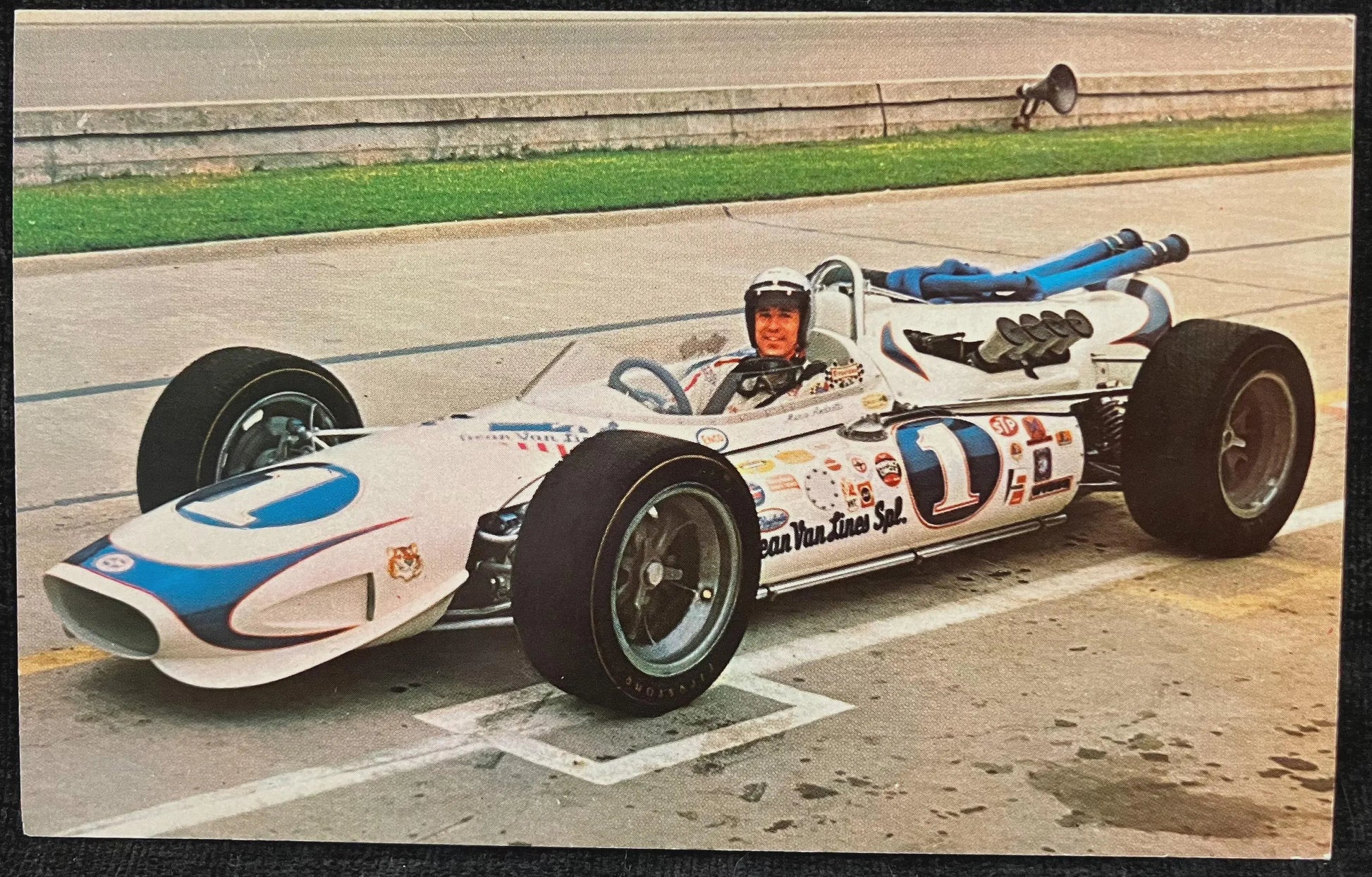 Back: MARIO ANDRETTI, two-time USAC National Driving Champion, in the Dean Van Lines Special, he used to set a new 10-mile qualifying record at the Indianapolis Motor Speedway in 1967 at an average speed of 168.982 miles an hour.
