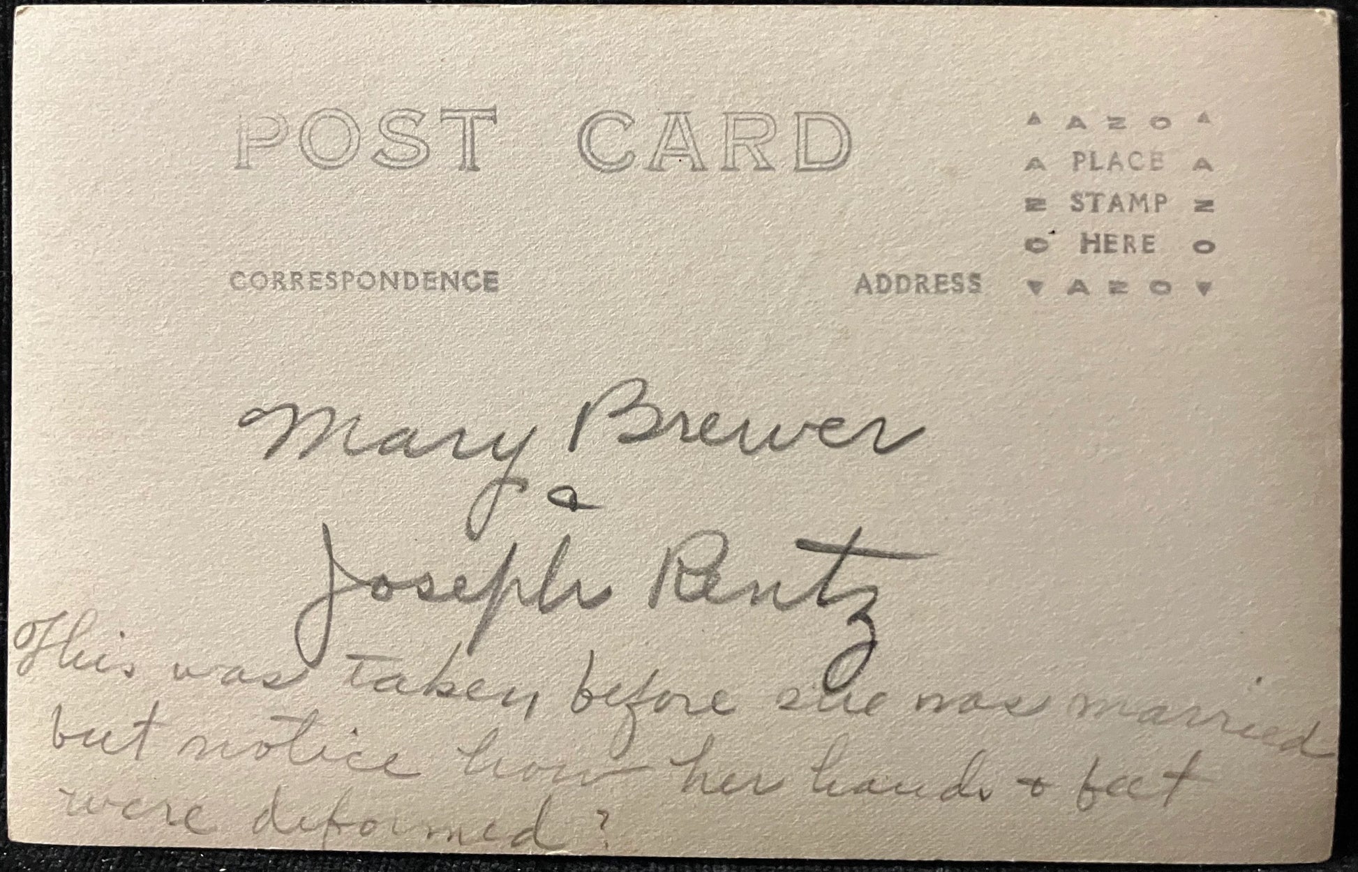 On front: A photo of an old older couple presumably Mary Brewer and Joseph P(enty)