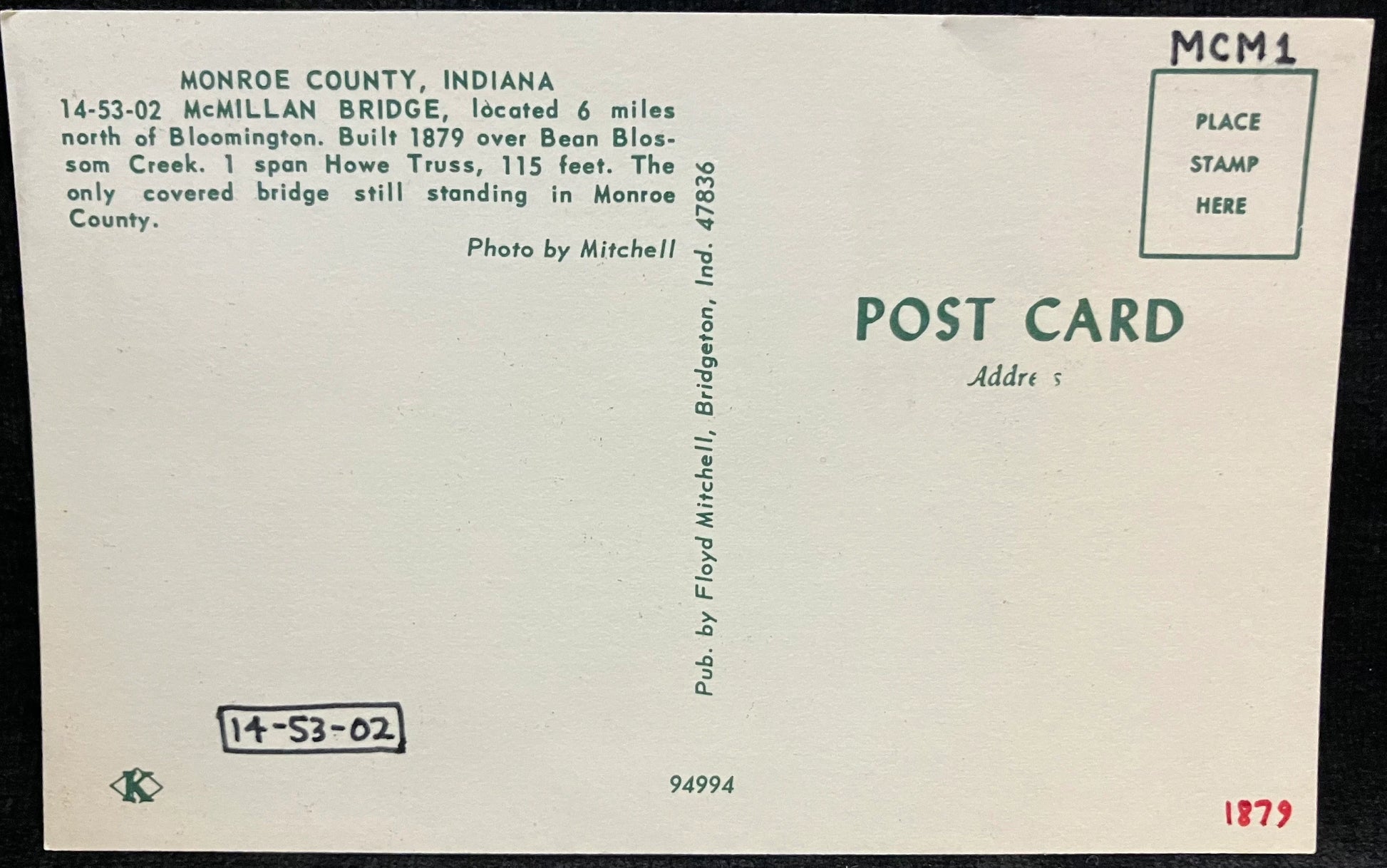 Back: MONROE COUNTY, INDIANA McMILLIAN BRIDGE, located 6 miles north of Bloomington. Built 1879 over Bean Blossom Creek. 1 span Howe Truss, 115 feet. The only covered bridge still standing in Monroe County.