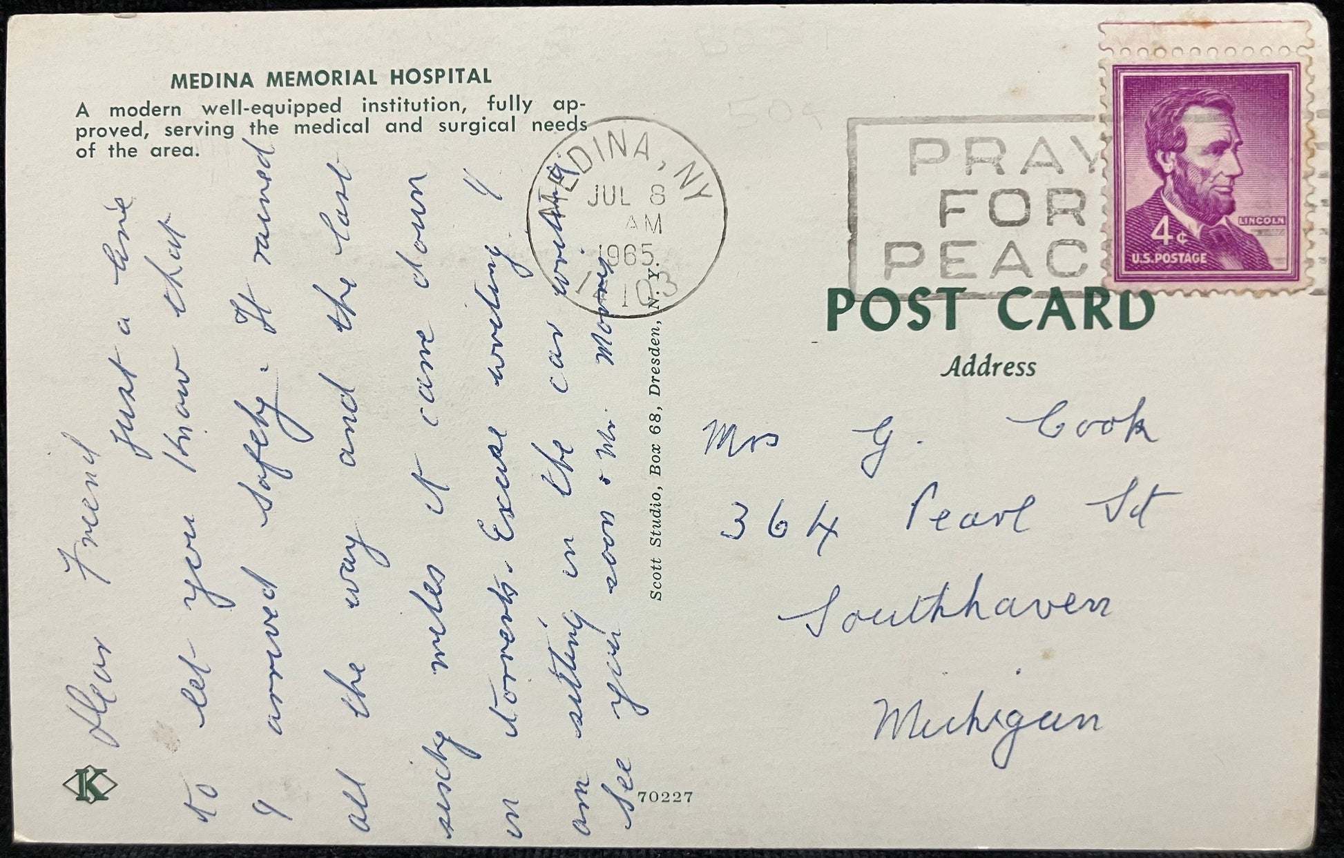 Back: Medina Memorial Hospital, A modern, well-equipped institution, fully approved, serving the medical and surgical needs of the area.