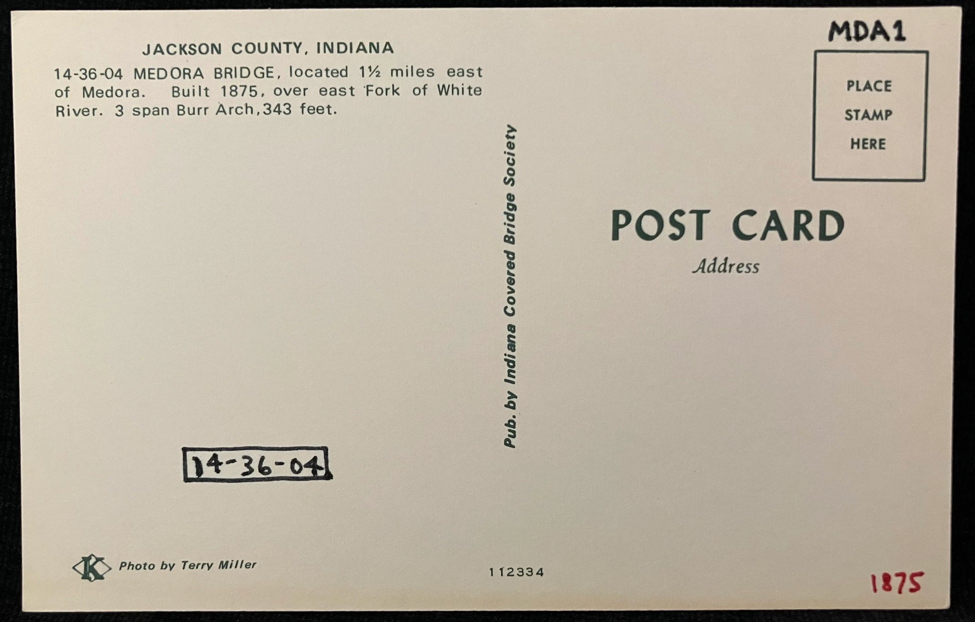 On back: JACKSON COUNTY, INDIANA 14-36-04 MEDORA BRIDGE, located 1 1/2 miles east of Medora. Built 1875, over east Fork of White River. 3 span Burr Arch, 343 feet.