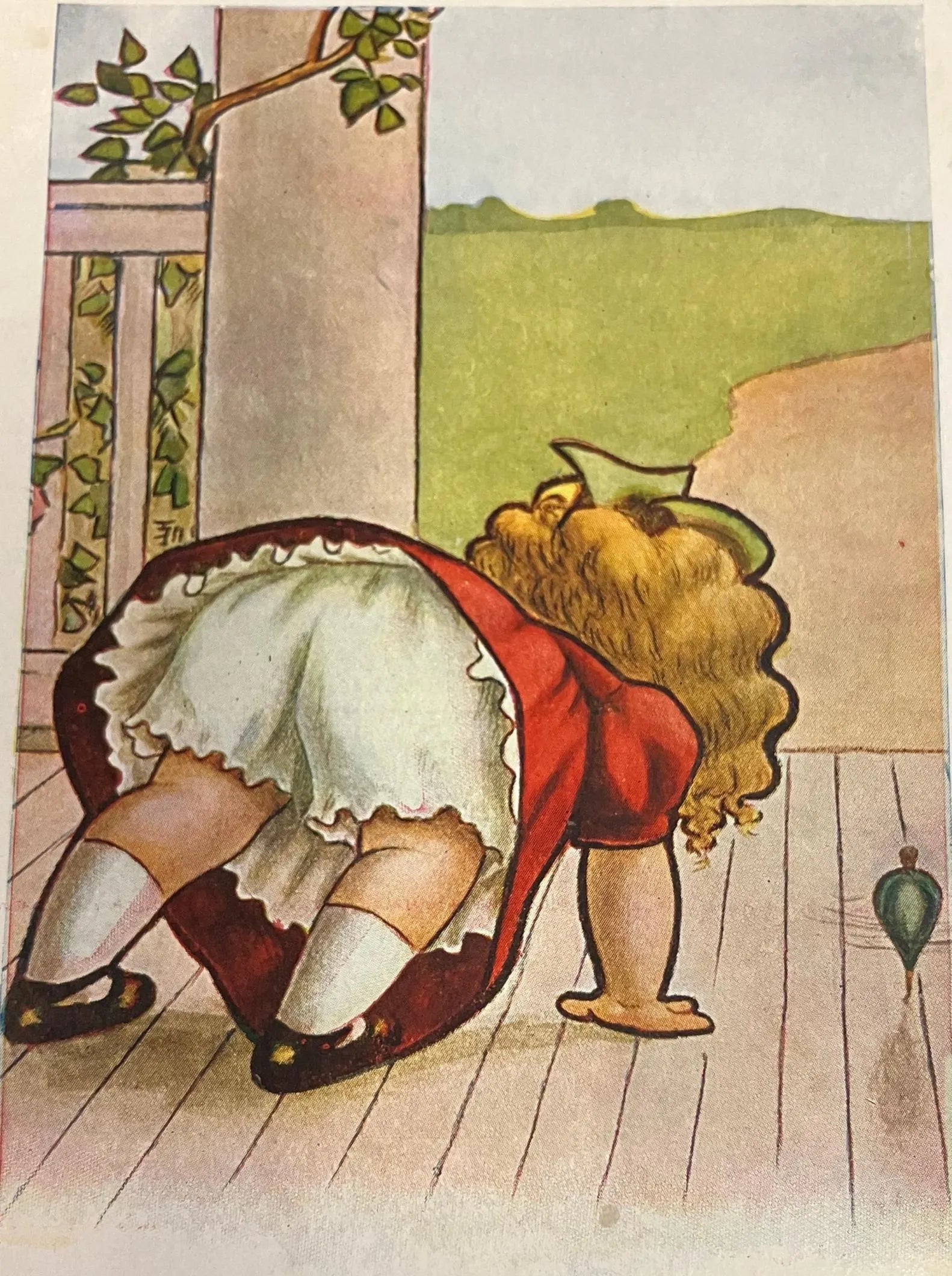 Meet Me Face to Face, little girl in red playing with a green top, vintage postcard