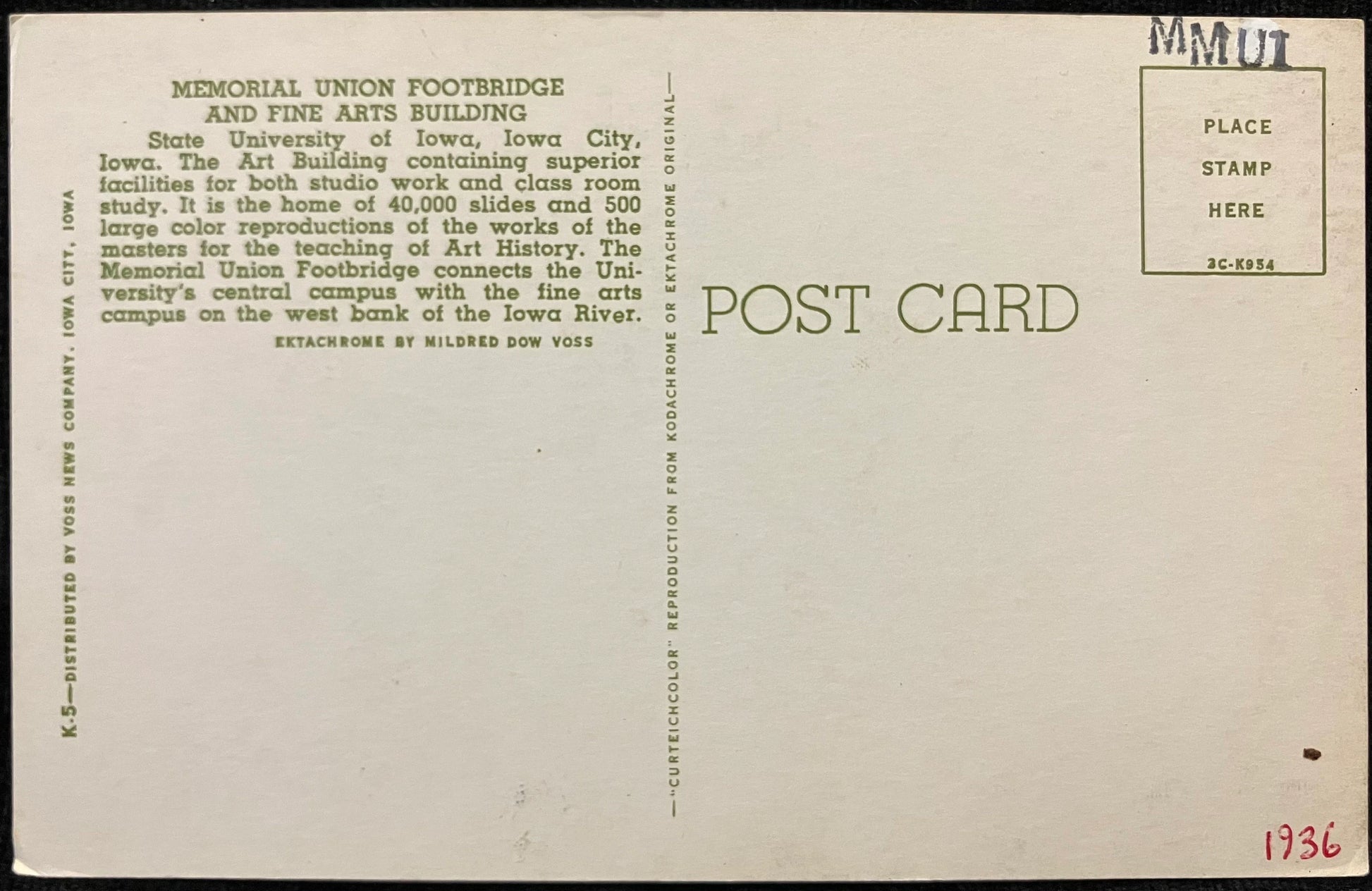 On back: MEMORIAL UNION FOOTBRIDGE AND FINE ARTS BUILDING | State University of Iowa, Iowa City, Iowa. The Art Building containing superior facilities for both studio work and class room study. It is the home of 40,000 slides and 500 large color reproductions of the works of the masters for the teaching of Art History. The Memorial Union Footbridge connects the University's central campus with the fine arts campus on the west bank of the Iowa River. | Ektachrome by Mildred Dow Voss