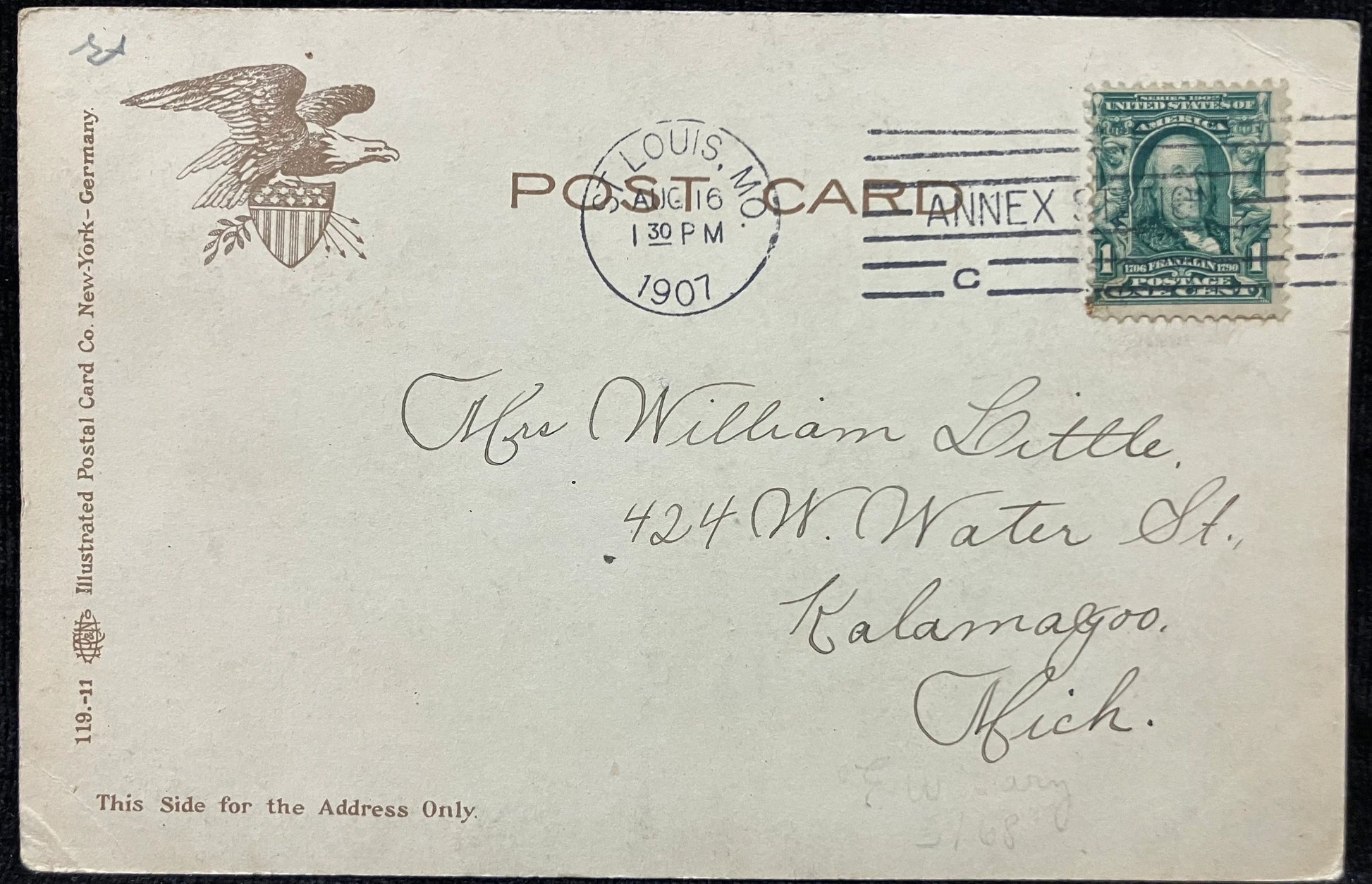 Mailed: Postmark: 1907 Green one cent Benjamin Franklin stamp