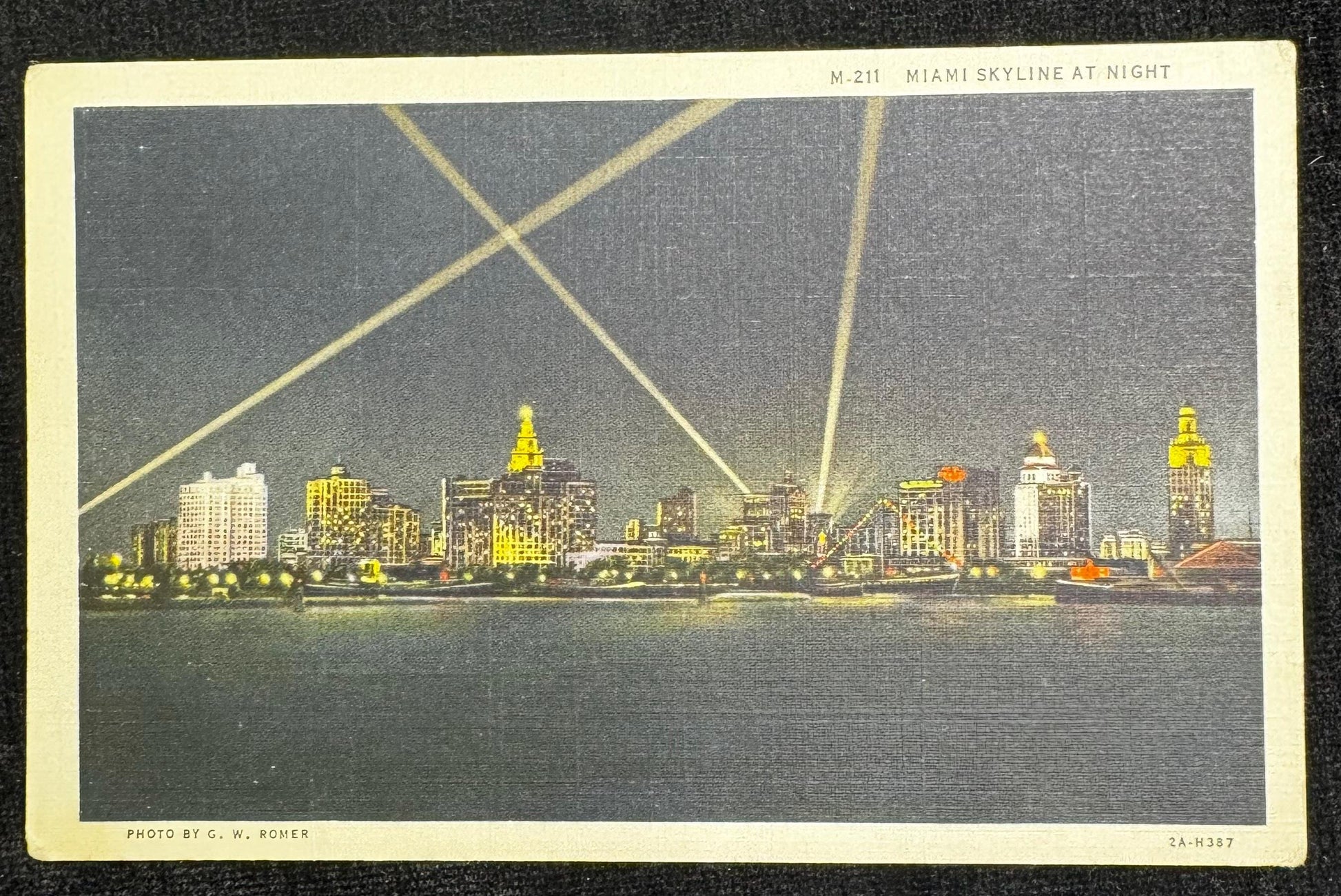 This vintage postcard is in great condition. Slight wear on corners. The front has an illustration of a Miami shoreline. The front reads "M. 211 Miami Skyline At Night".