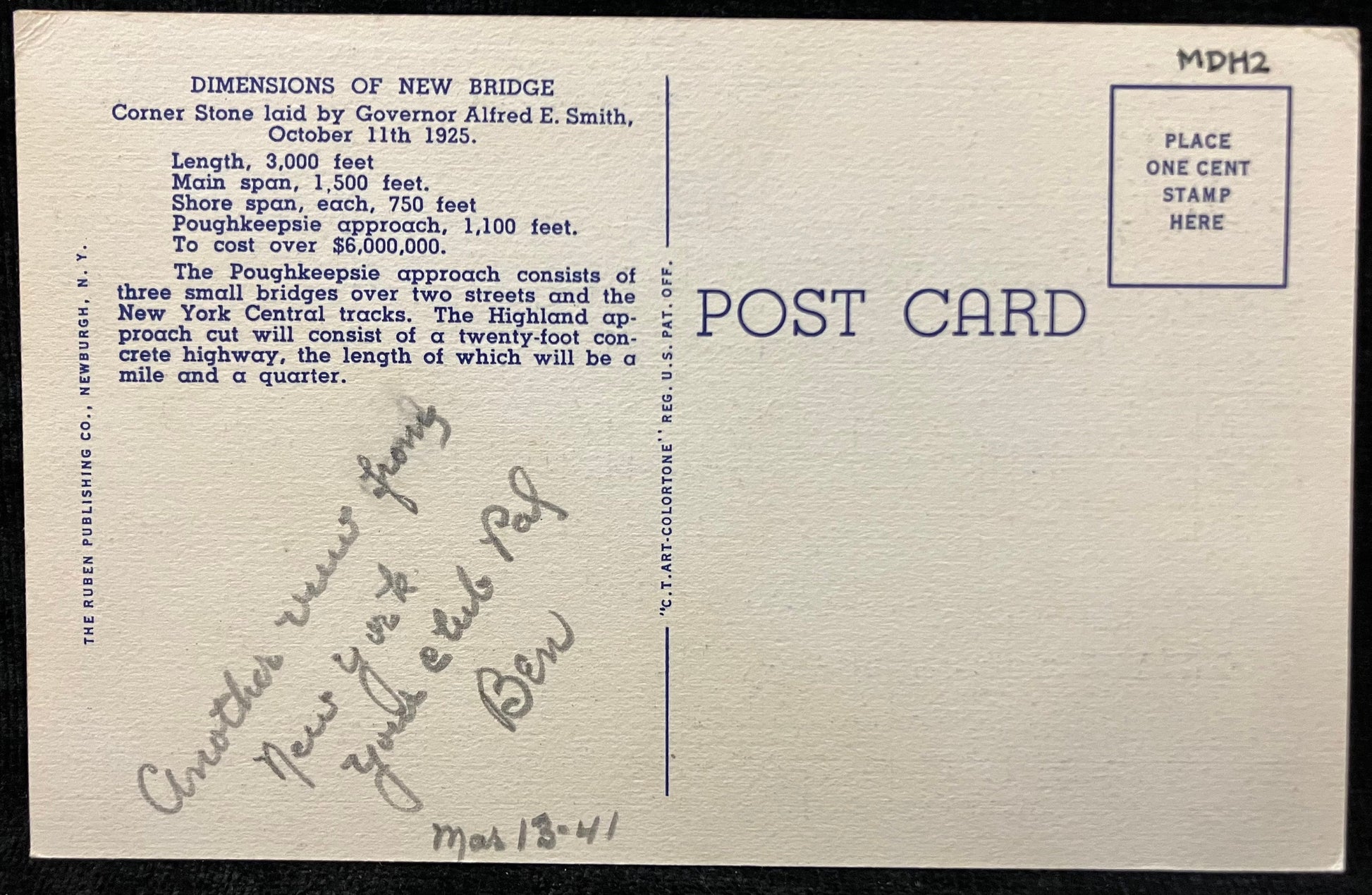On back: DIMENSIONS OF NEW BRIDGE Corner Stone laid by Governor Alfred E. Smith, October 11th, 1925. Length, 3,000 feet Main span, 1,500 feet. Shore span, each, 750 feet Poughkeepsie approach, 1,100 feet. To cost over $6,000,000. The Poughkeepsie approach consists of three small bridges over two streets and the New York Central tracks. The highland approach cut will consist of a twenty-foot concrete highway, the length of which will be a mile and a quarter.