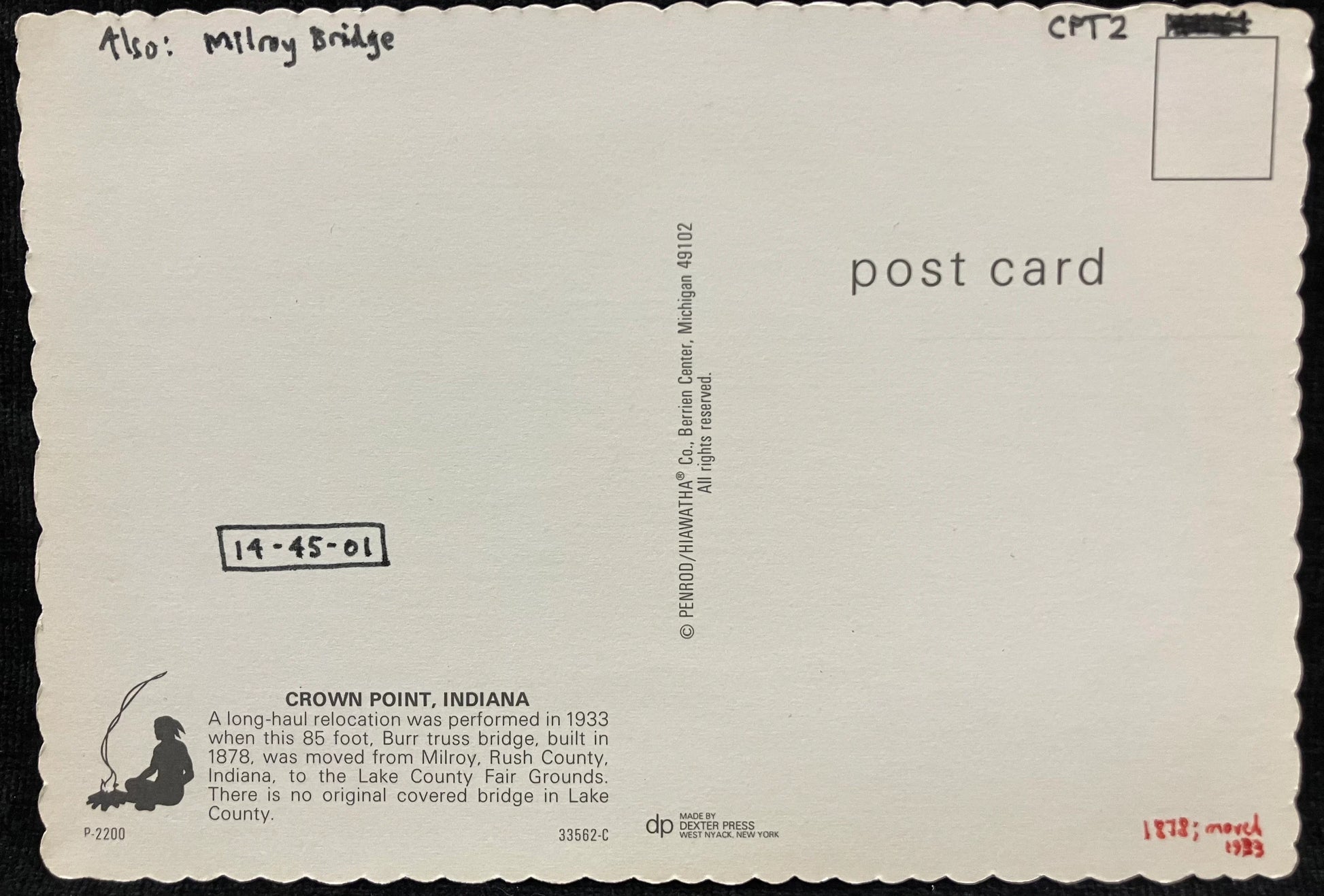Back: CROWN POINT, INDIANA A long-haul relocation was performed in 1933 when this 85 foot, Burr truss bridge, built in 1878, was moved from Milroy Rush County, Indiana, to the Lake County Fair Grounds. There is no original covered bridge in Lake County.