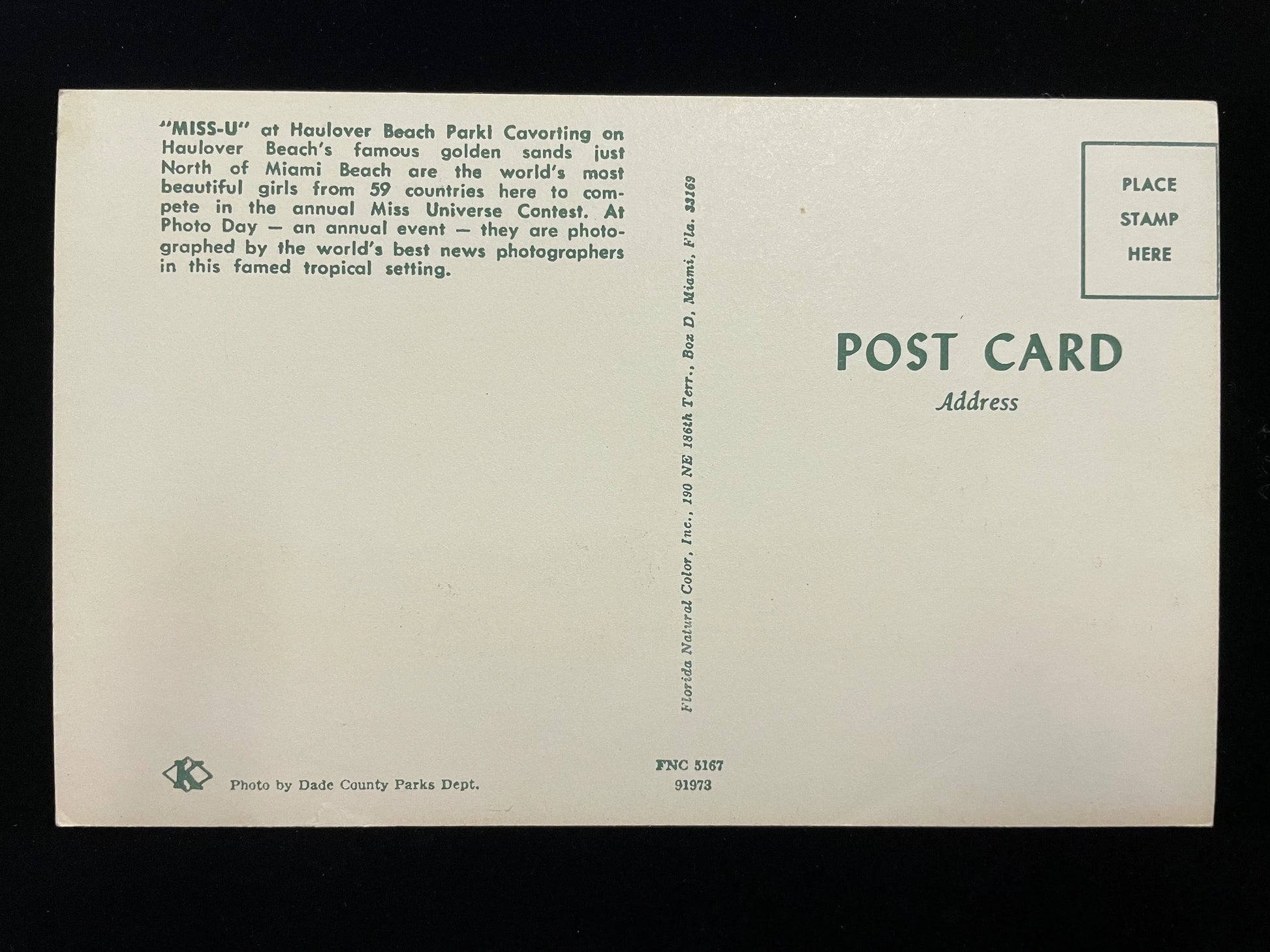 Back Information -- "MISS-U" at Haulover Beach Park! Cavorting on Haulover Beach's famous golden sands, just North of Miami Beach, are the world's most beautiful girls from 59 countries here to compete in the annual Miss Universe contest. At Photo Day-- an annual event -- they are photographed by the world's best news photographers in this famed tropical setting.