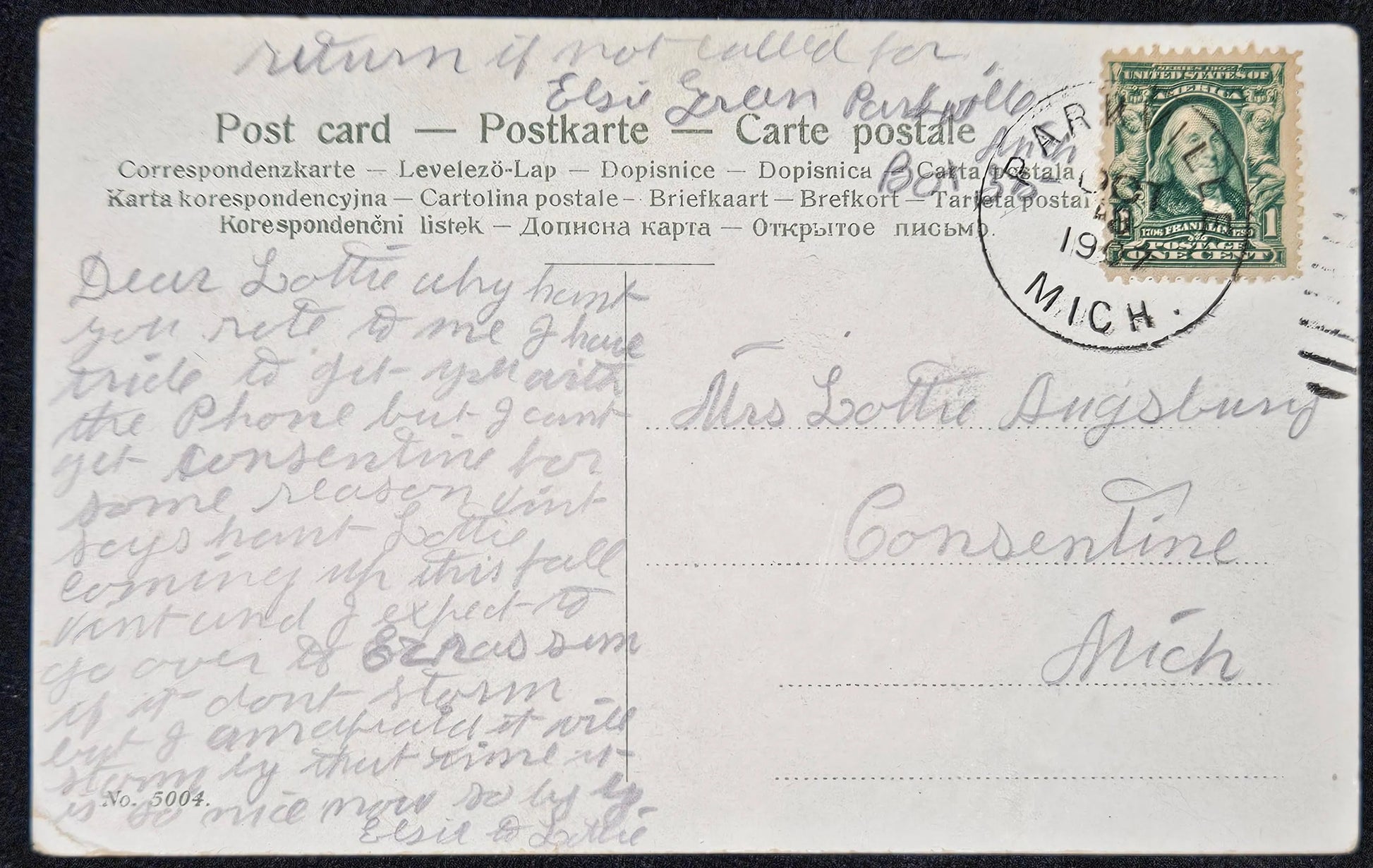 Mailed: Postmark 1912 green one cent Benjamin Franklin stamp