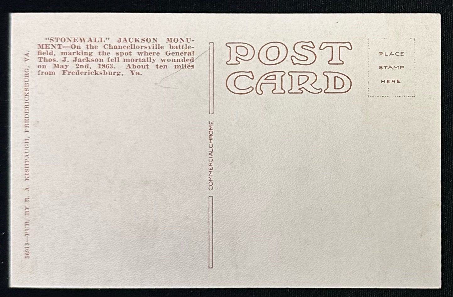Monument to Gen. Thos. J. Jackson (Stonewall) near Frederksburg, VA. - Vintage 1940s Military Postcard
