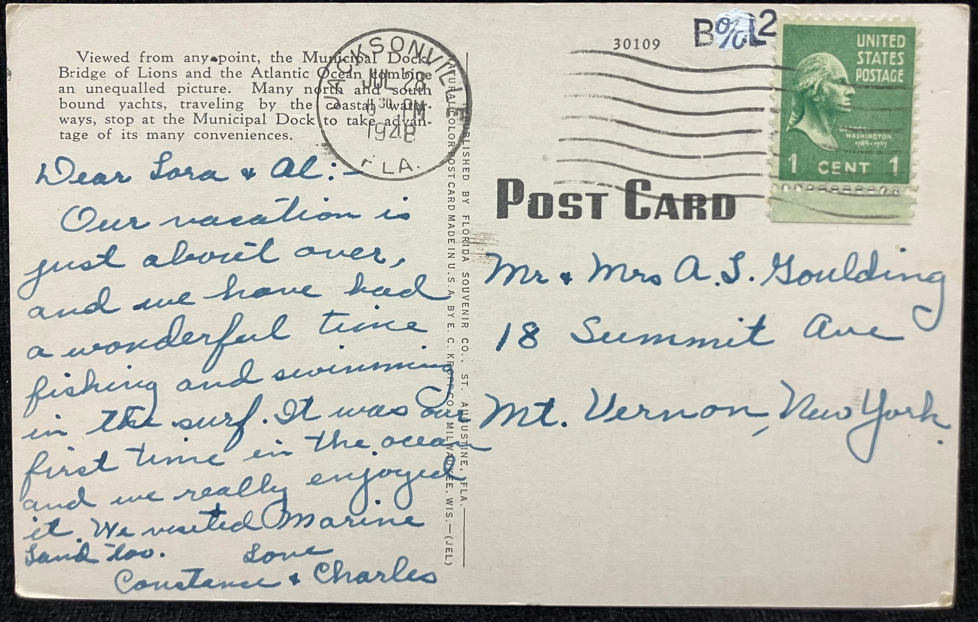 Mailed: Postmark 1948 Jacksonville, FLA. green one cent George Washington