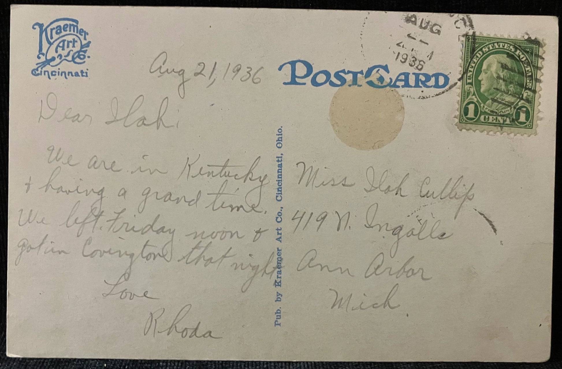 Mailed: Postmark on Aug 22, 1936. Green one cent Benjamin Franklin stamp