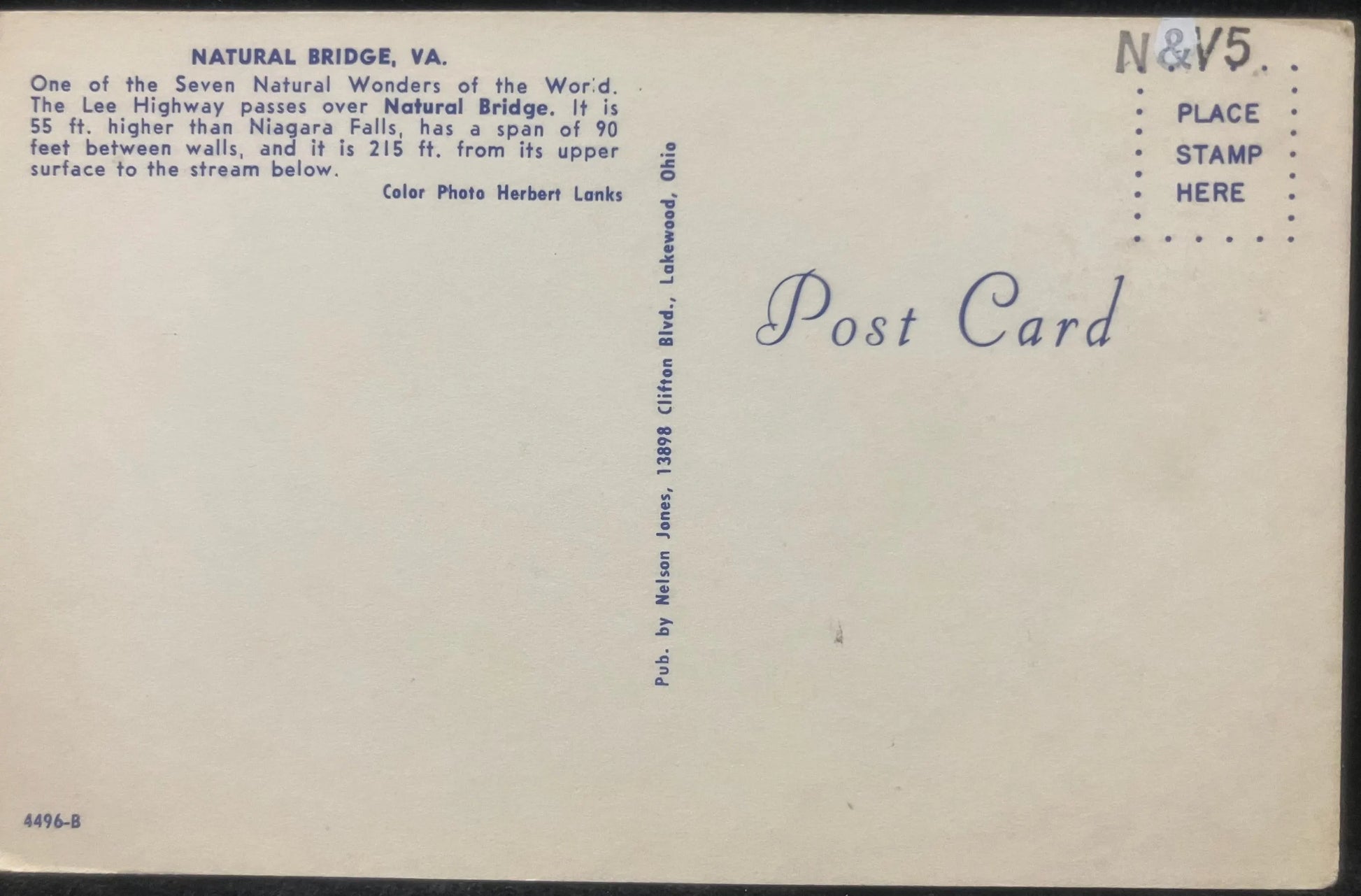 Back: NATURAL BRIDGE, VA. One f the Seven Natural Wonders of the World. The Lee Highway passes over Natural bridge. it is 55 ft. higher than Niagara Falls, has a span of 90 feet between walls, and it is 215 ft. from its upper surface to the stream below.