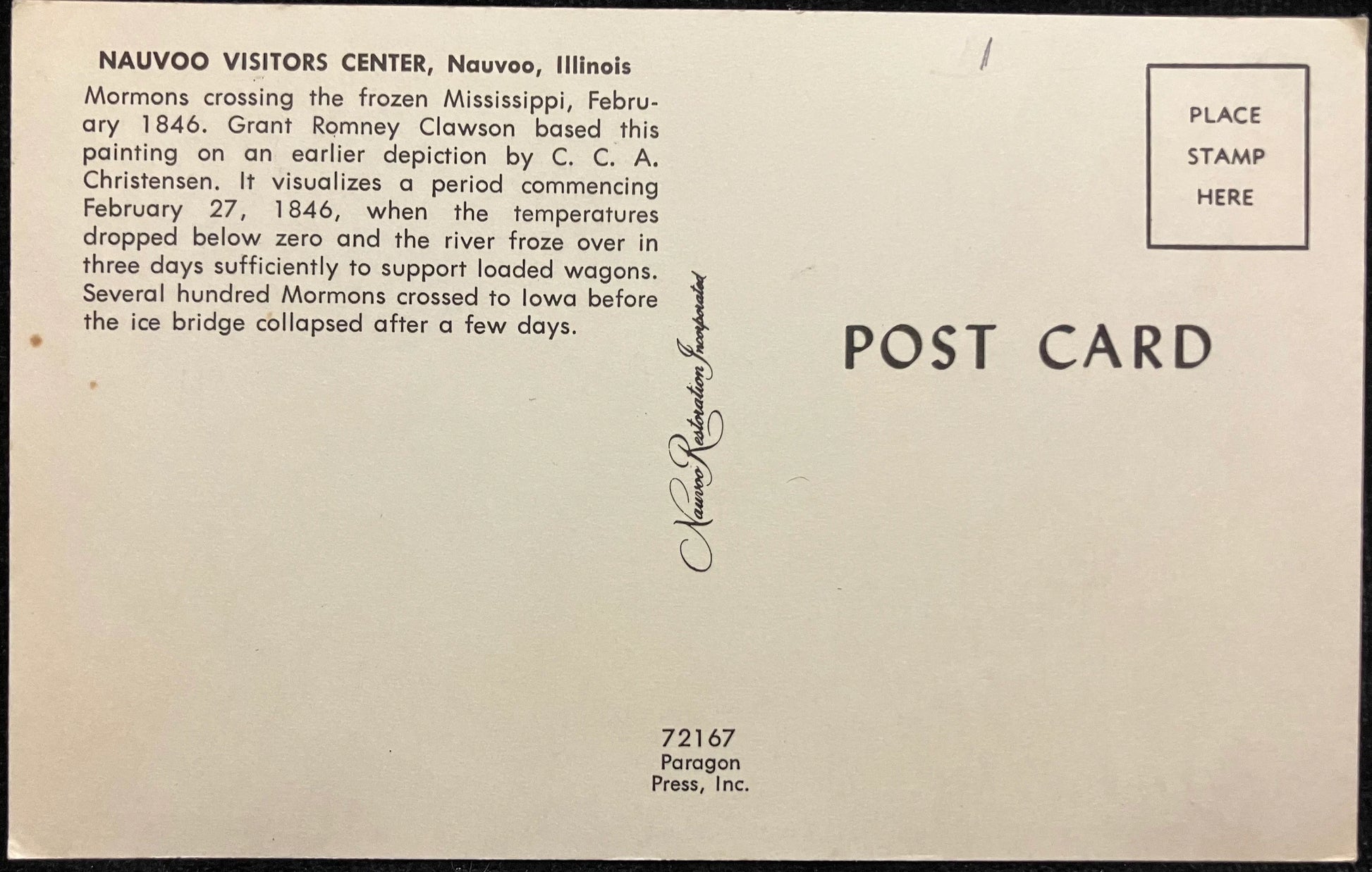 On back: Nauvoo Visitors Center, Nauvoo, Illinois Mormons crossing the frozen Mississippi, February 1846 . Grant Romney Clawson based this painting on an earlier depiction by C. C. A. Christensen. It visualizes a period commencing February 27, 1846, when the temperatures dropped below zero and the river froze over in three days sufficiently to support loaded wagons. Several hundred Mormons crossed to Iowa before the ice bridge collapsed after a days.