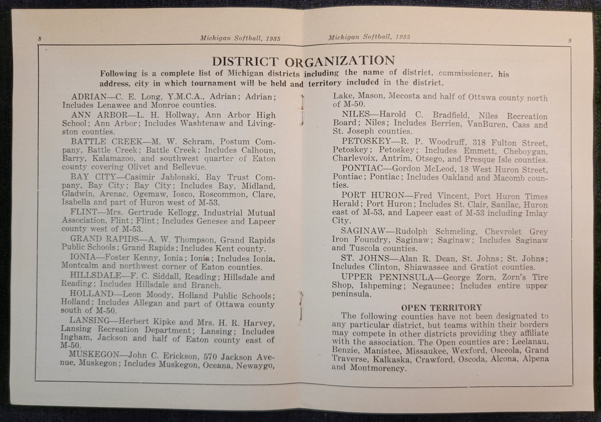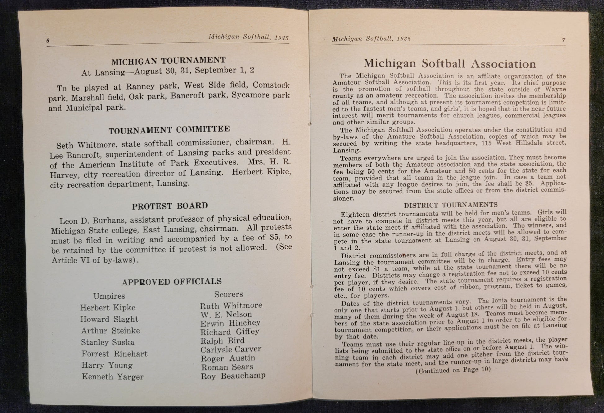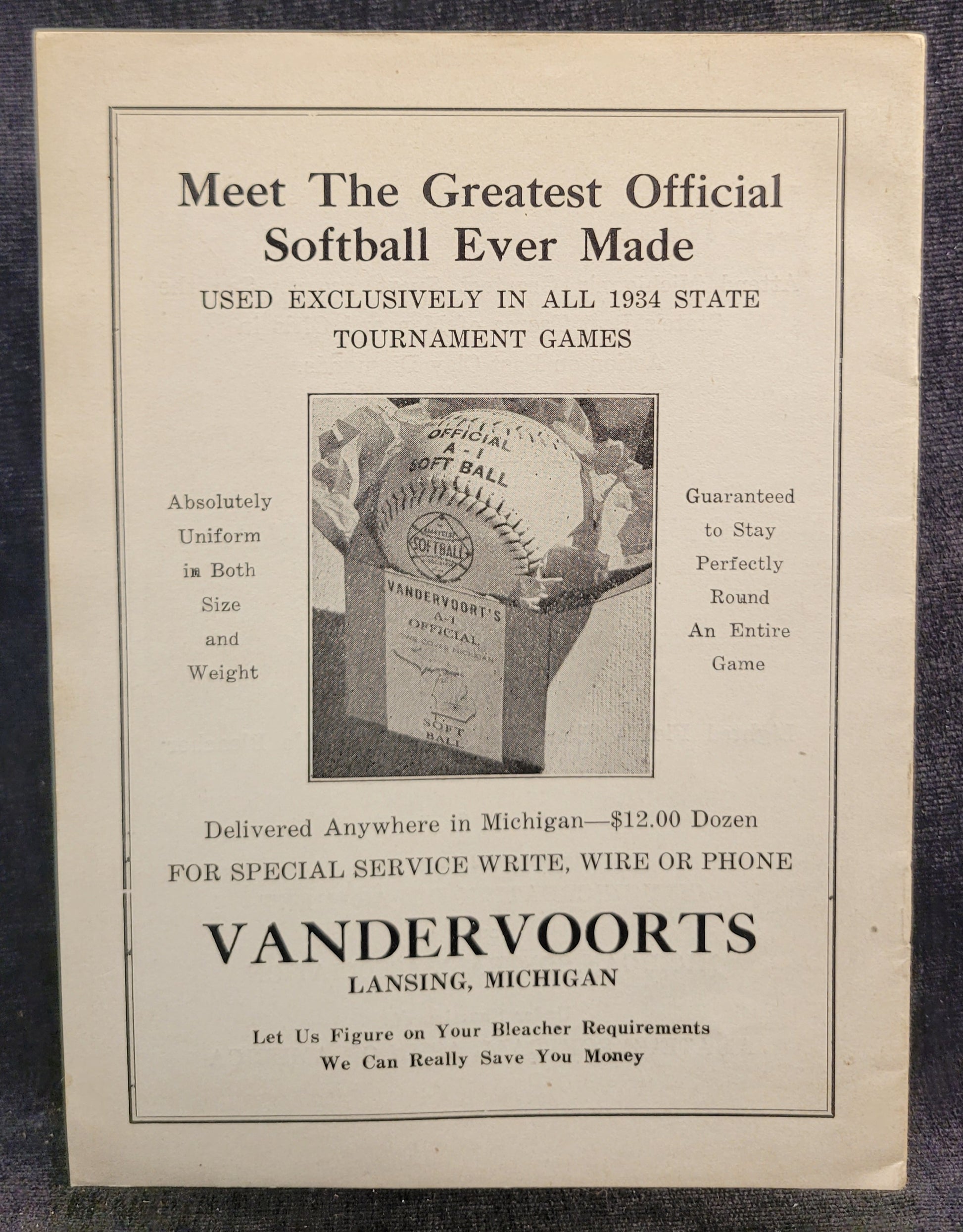 This booklet was published by the Michigan Softball Association in 1935 in Lansing, Michigan. It details some of the best softball products of the time as well as an explanation of different associations and district organizing. All of these booklets are in excellent condition with only minor evidence of use around the edges of the pages.
