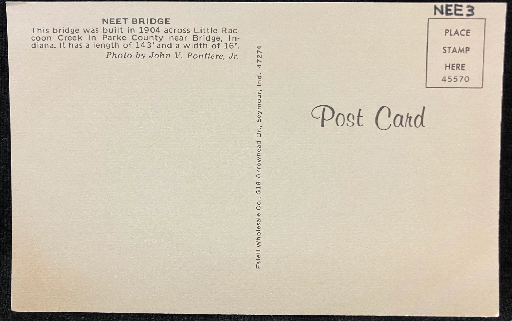 Neet Bridge near Bridge, Indiana - Photo: John Pontiere Jr. - Vintage Covered Bridge Postcard