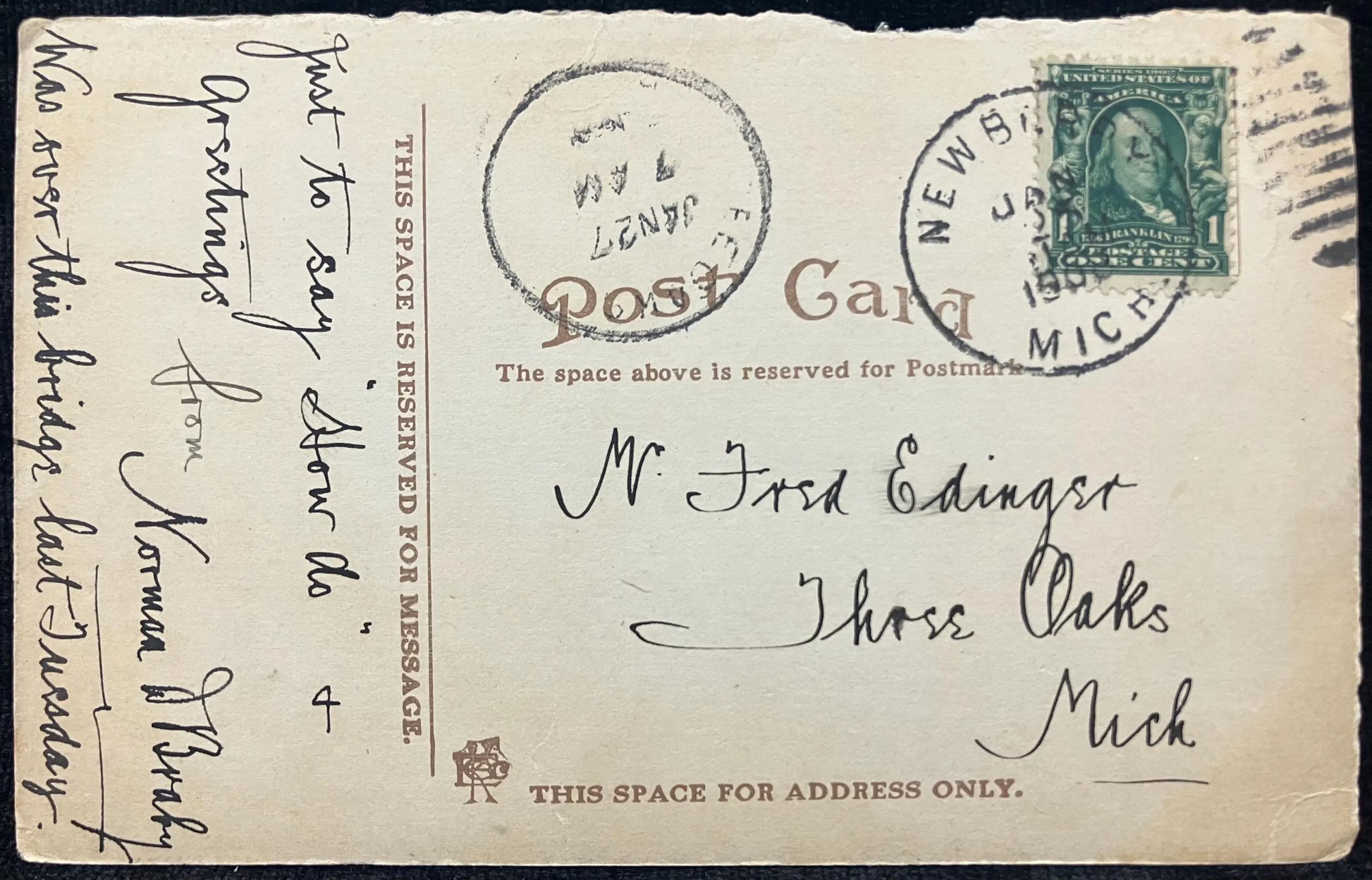 Mailed: Postmark: 1908 green one cent Benjamin Franklin stamp