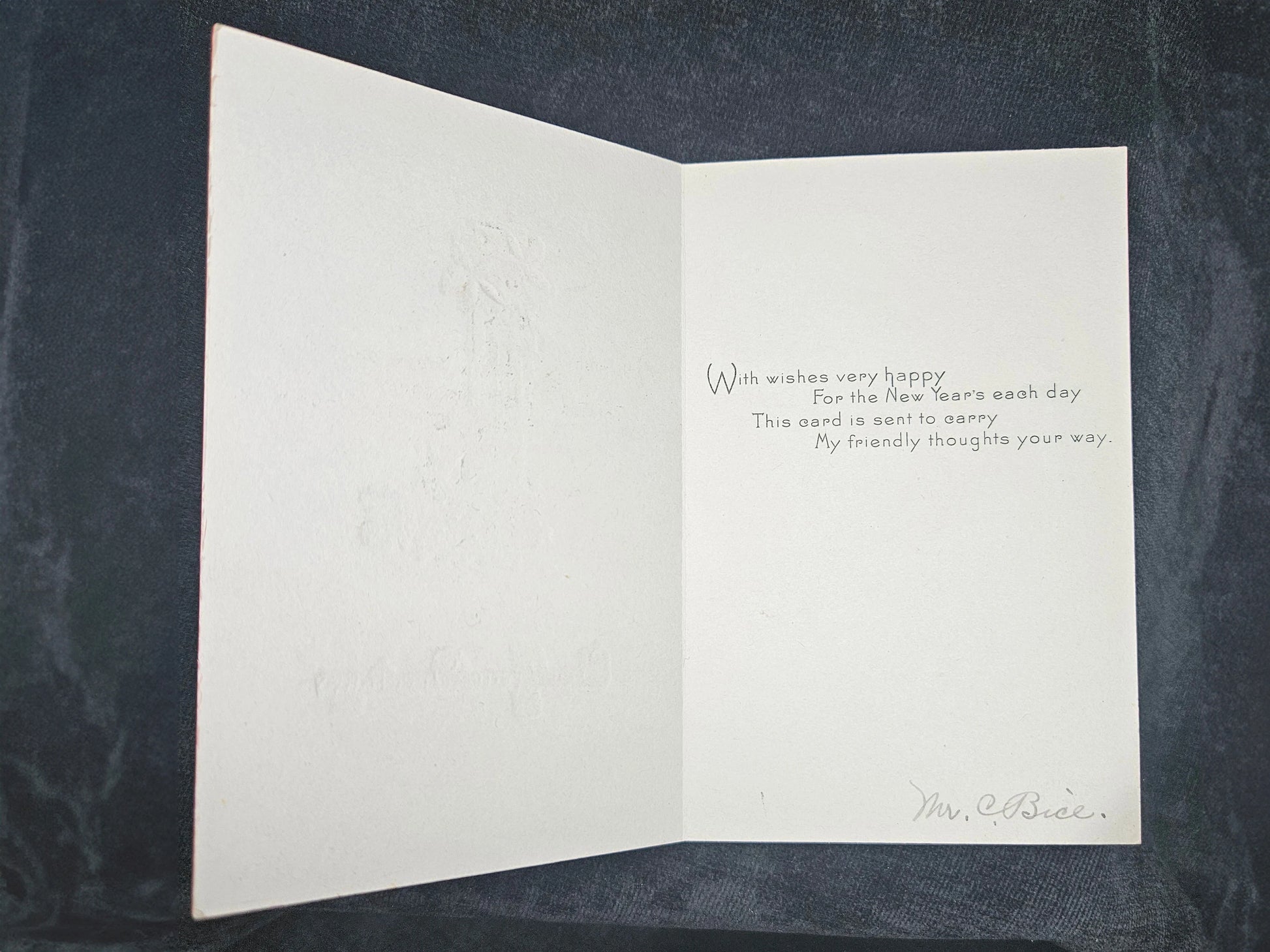 New Year Greetings, Engraved Black and Red Christmas Card with Lantern and Holly - Art Deco Christmas Card 1910 -1920 - signed