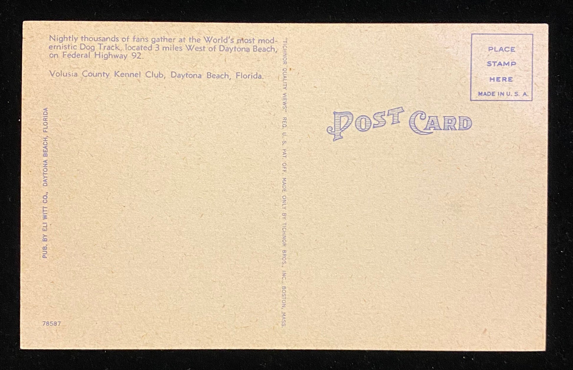 Back Information: "Nightly thousands of fans gather at the World's most modernistic Dog Track, located 3 miles West of Daytona Beach, on Federal Highway 92. Volusia County Kennel Club, Daytona Beach, Florida."