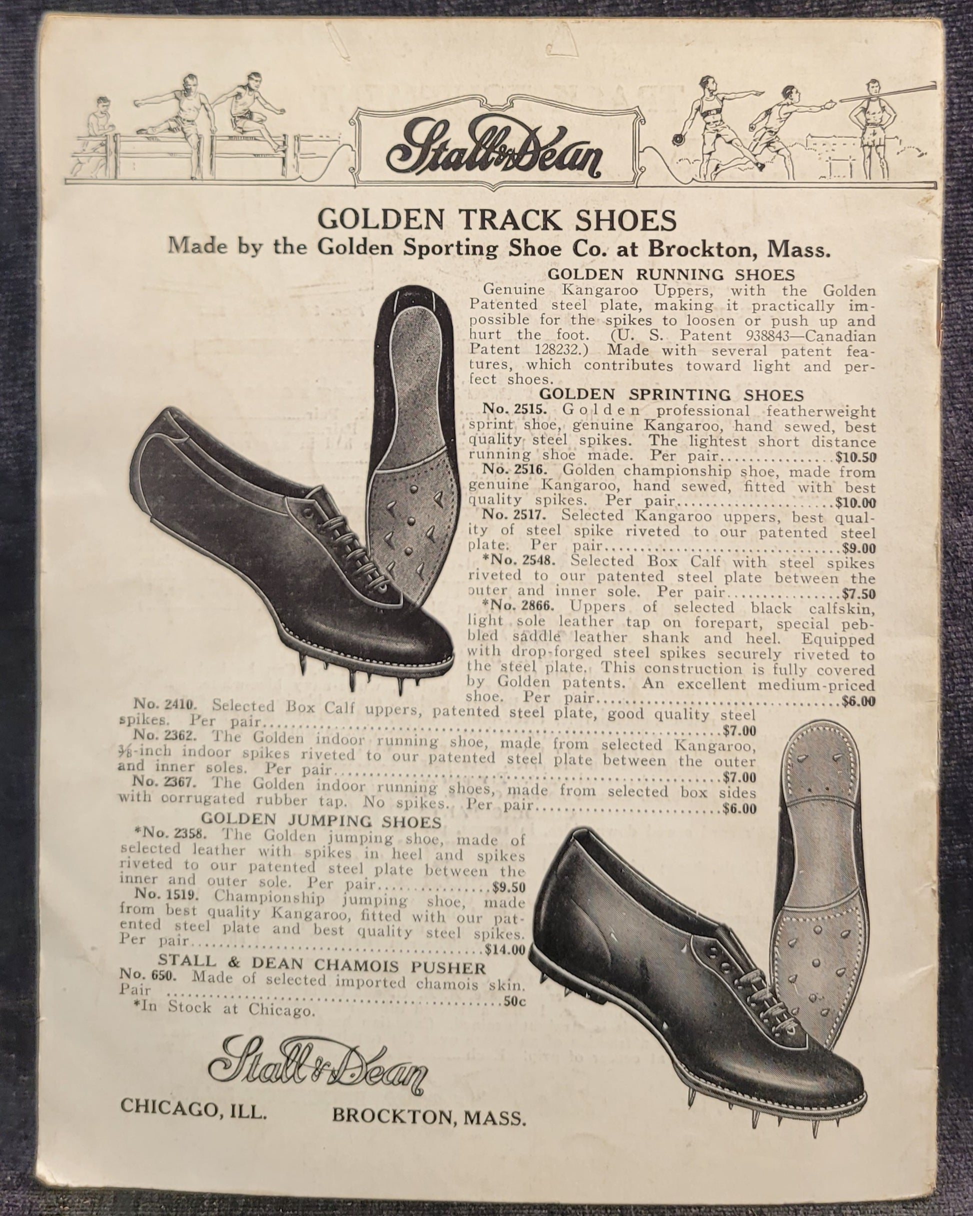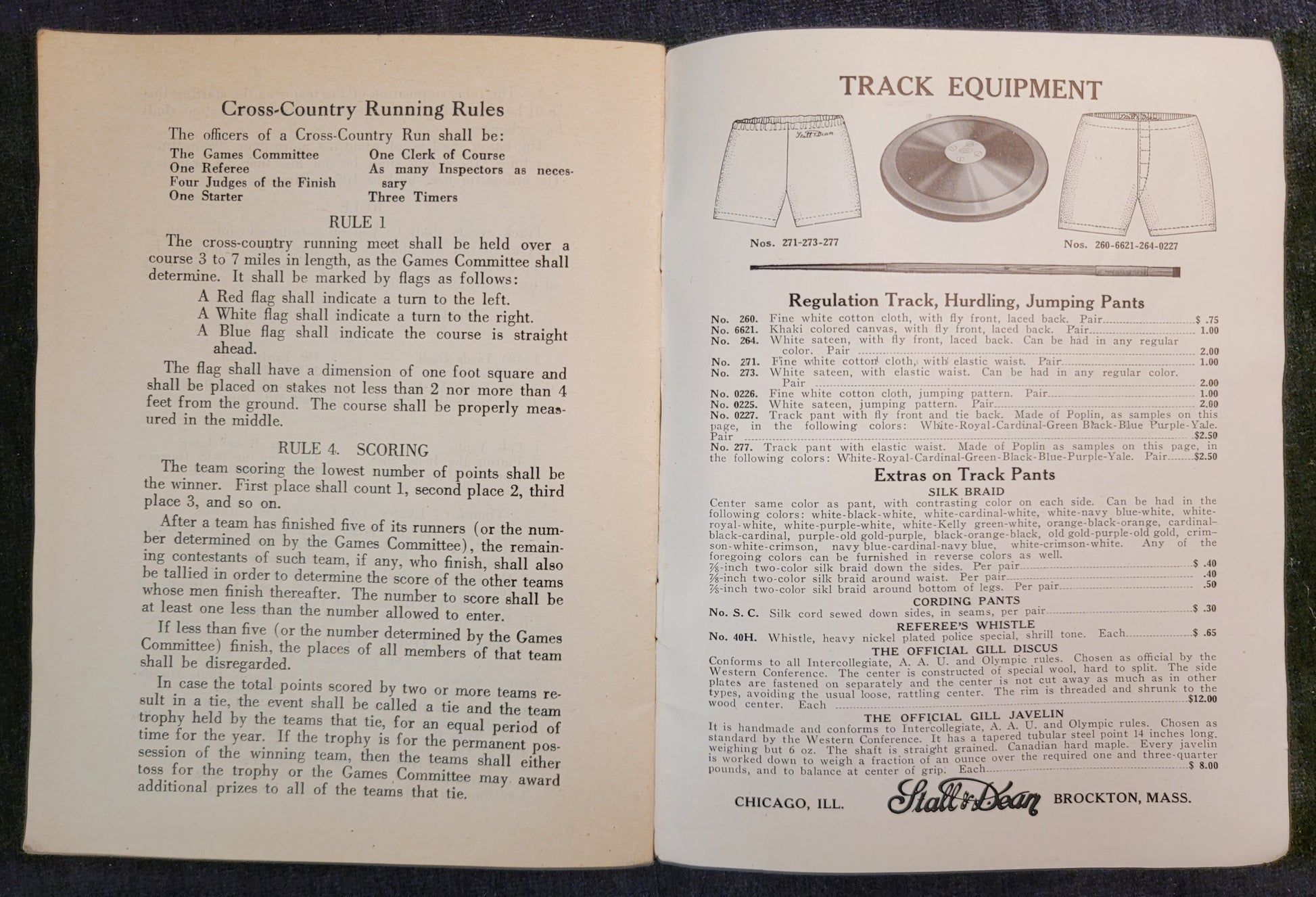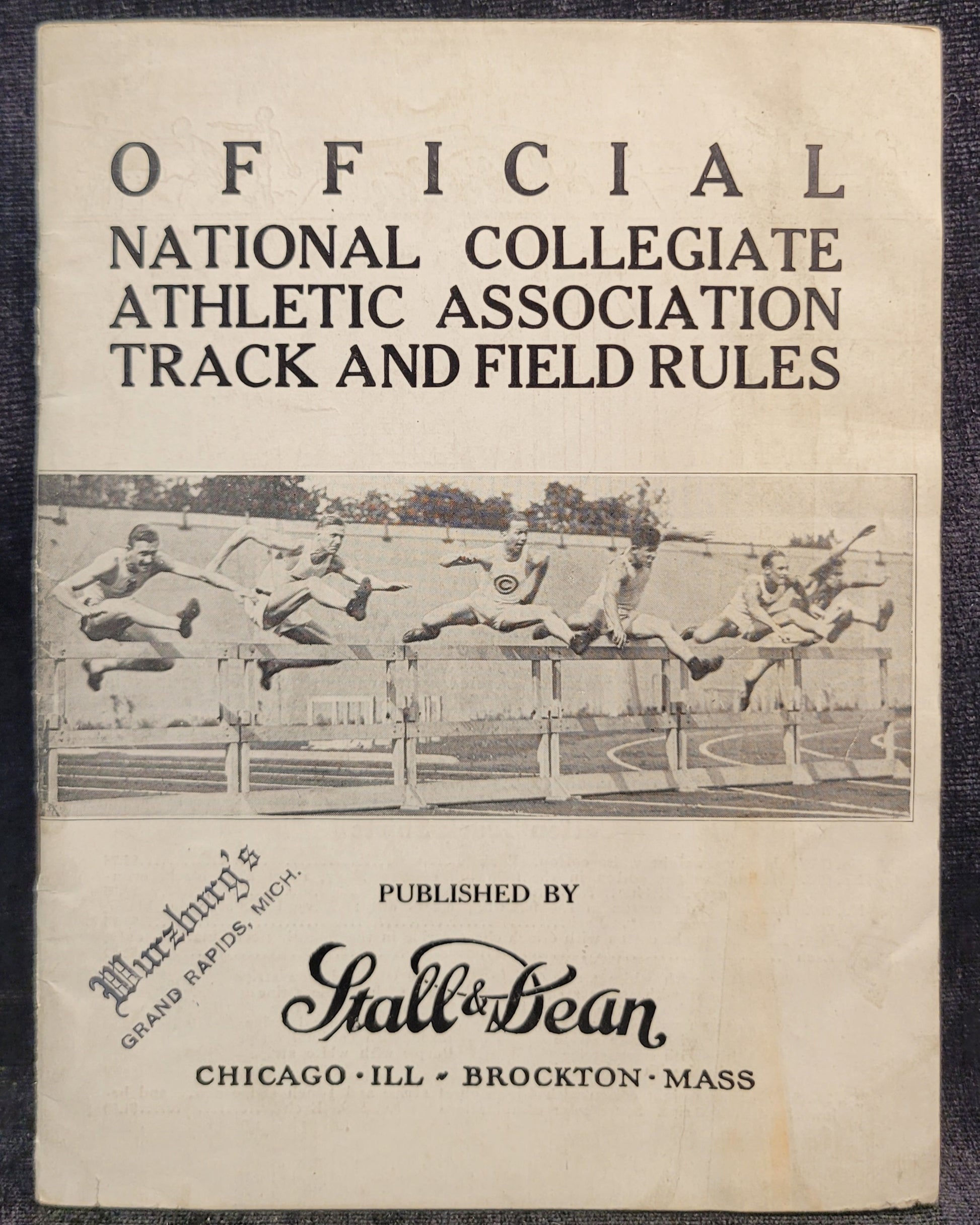 This rule book was published by Stall and Dean in the late 1920s. It thoroughly explains the rules of different track and field events, and discusses scores and statistics from previous academic years. It is in good condition, with only mild discoloration and signs of use. It was later available at Wurzburg department store in Grand Rapids, Michigan.