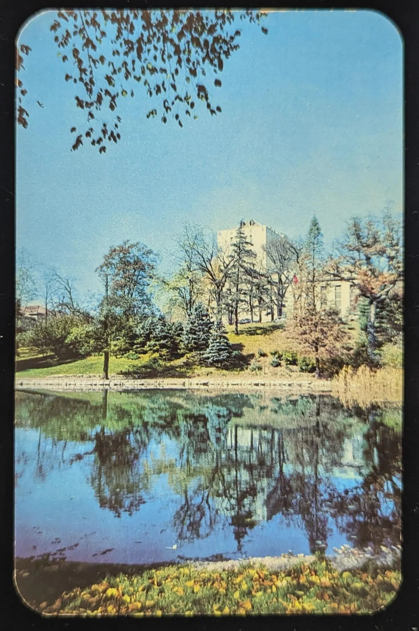 Reflected in the Mirror Lake is Ohio State University's William Oxley Thompson Memorial Library, Columbus, Ohio.