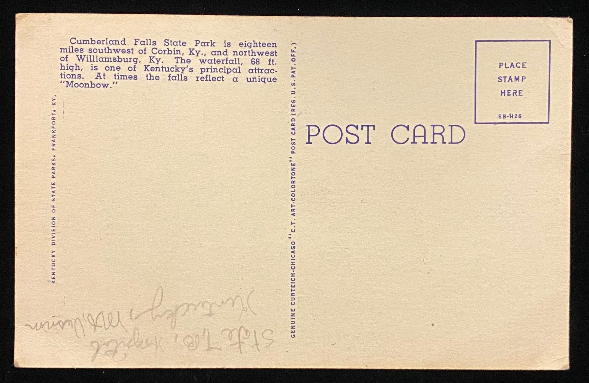 Back: "Cumberland Falls State Park is eighteen miles southwest of Corbin, Ky., and northwest of Williamsburg, Ky. The waterfall, 68 ft. high, is one of Kentucky's principal attractions. At times the falls reflect a unique 'Moonbow.'"