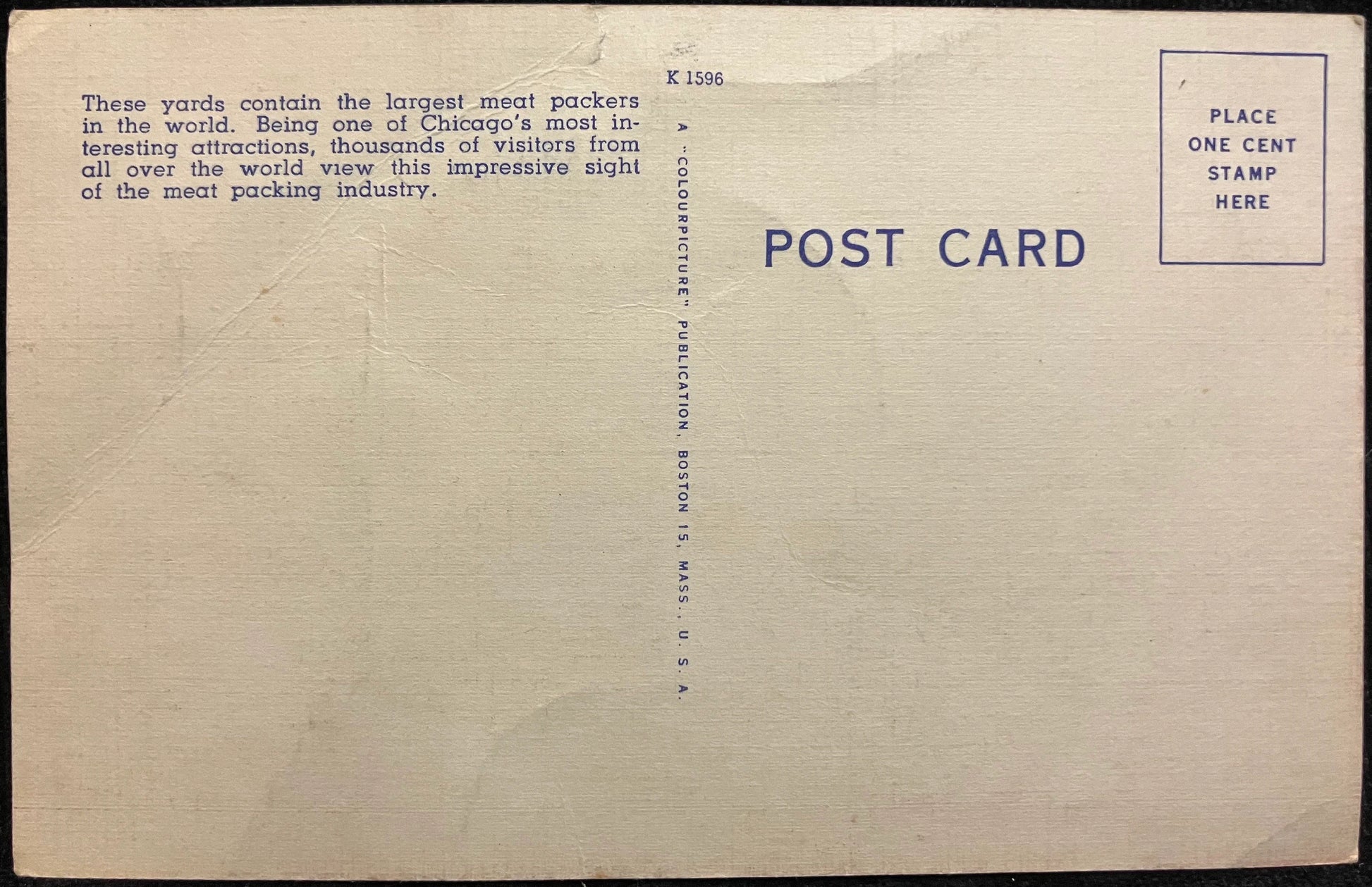 On back: These yards contain the largest meat packers in the world. Being one of Chicago's most interesting attractions, thousands of visitors from all over the world view this impressive sight of the meat packing industry.