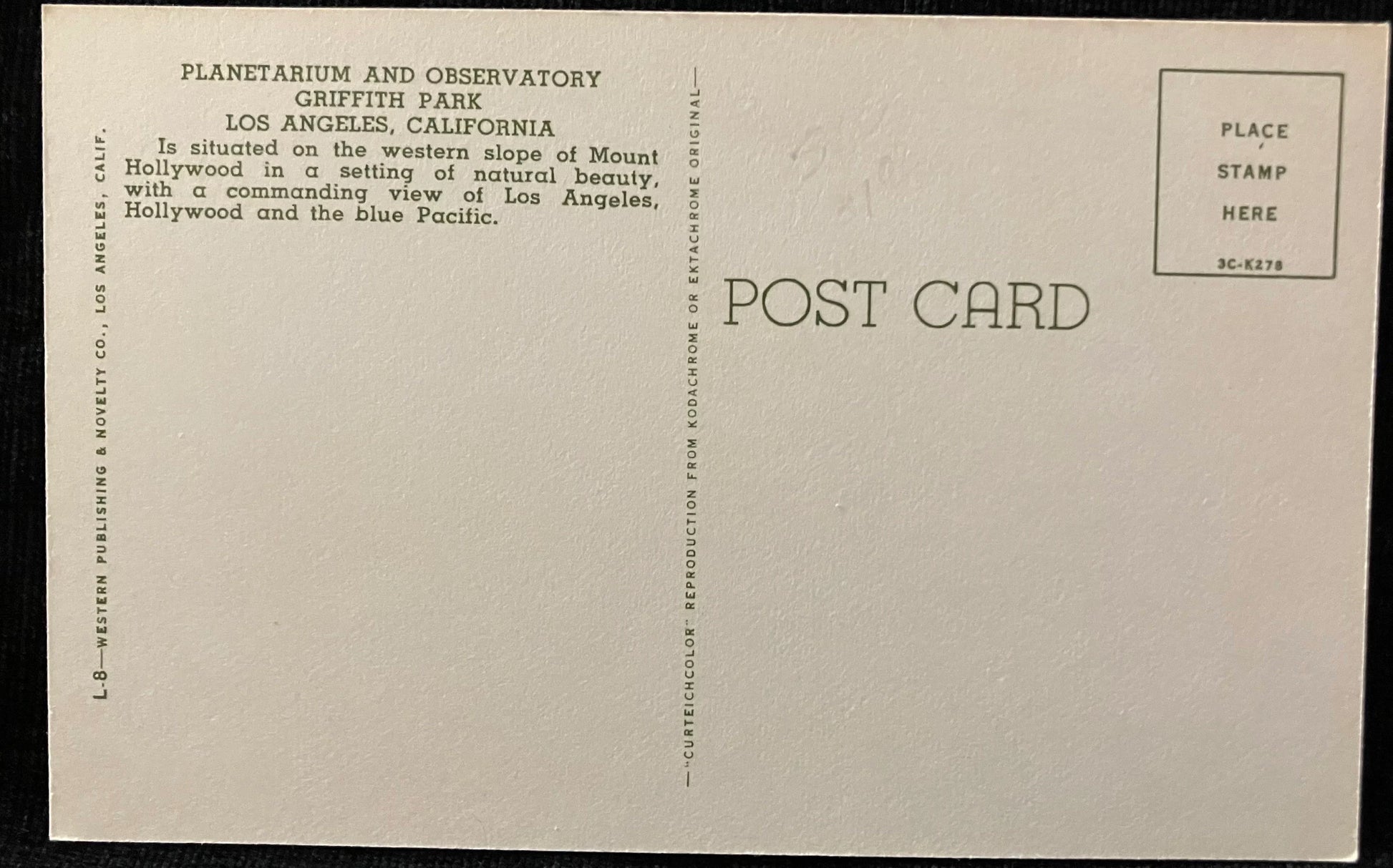 Back: PLANETARIUM AND OBSERVATORY GRIFFITH PARK LOS ANGELES, CALIFORNIA Is situated On the western slope of Mount Hollywood in a settling of natural beauty, with a commanding view of Los Angeles, Hollywood and the blue Pacifc.