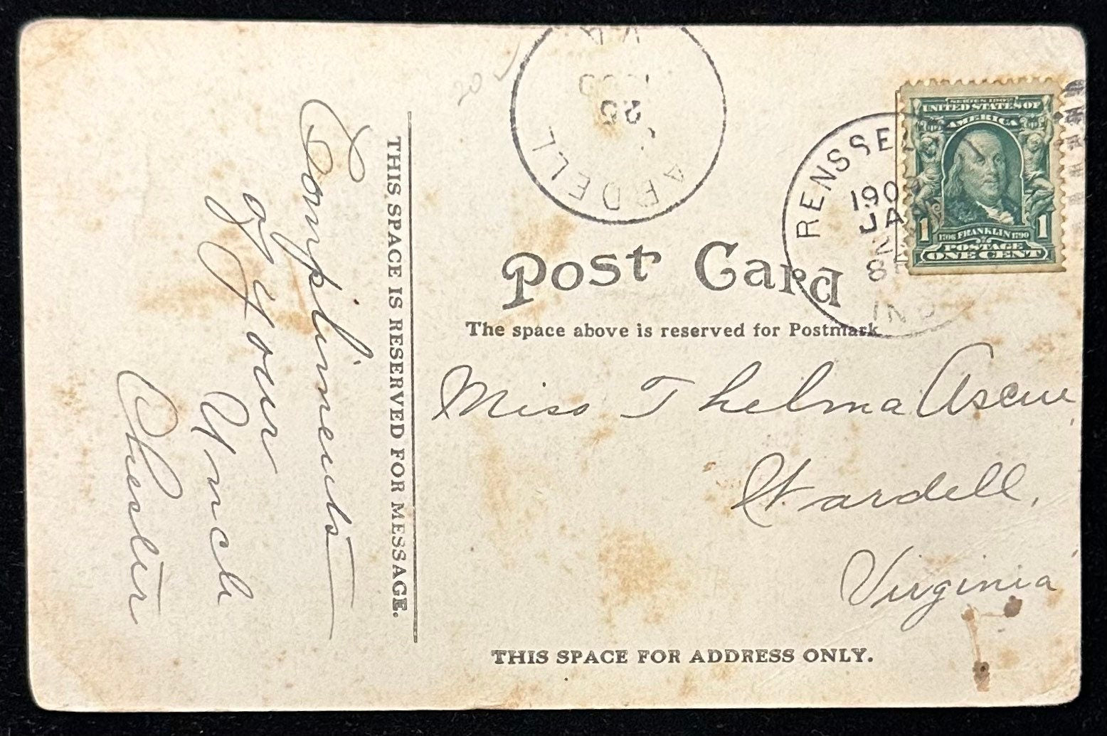 Mailed: Posted on January 25, 1909 from Rensselaer, Indiana with a green 1 cent Benjamin Franklin stamp