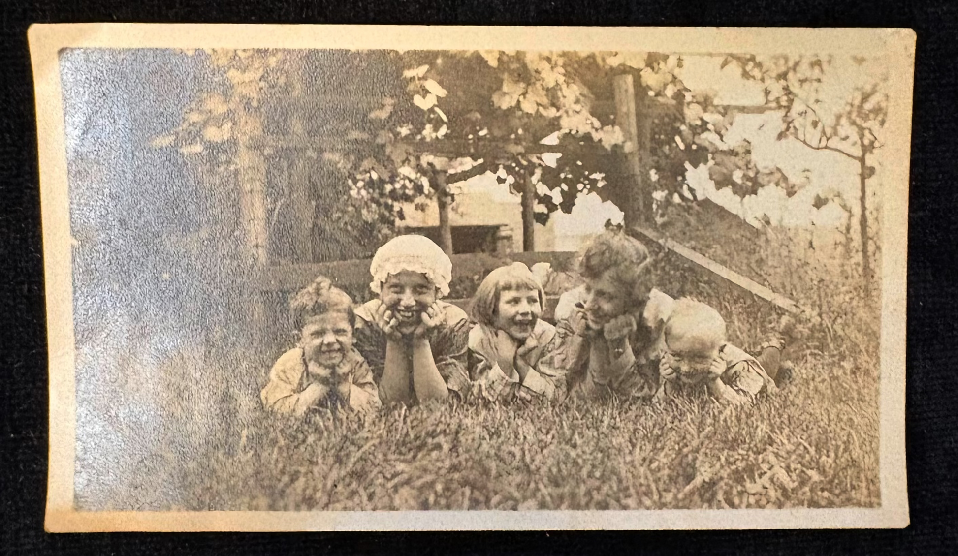 This photo, likely taken around the introduction of portable photography in the 1890s, showcases a beautiful farming family in the Midwest. The mother's bonnet resembles a typical Dutch cap worn by migrants from the Netherlands at the time. the photo itself is a thin sepia-toned paper print, likely Kodak's 116 film from 1899. This family may have met a traveling photographer who offered to take their photo and send it to Kodak to be developed, and it may have been the first time they saw a camera. The candid and playful nature of this family stands in stark contrast to sit-down photographs of the era, famous for their lack of smiles in the early days of photography. Everyone wanted to pose the with hands supporting the chin. Note the woman is missing a tooth,