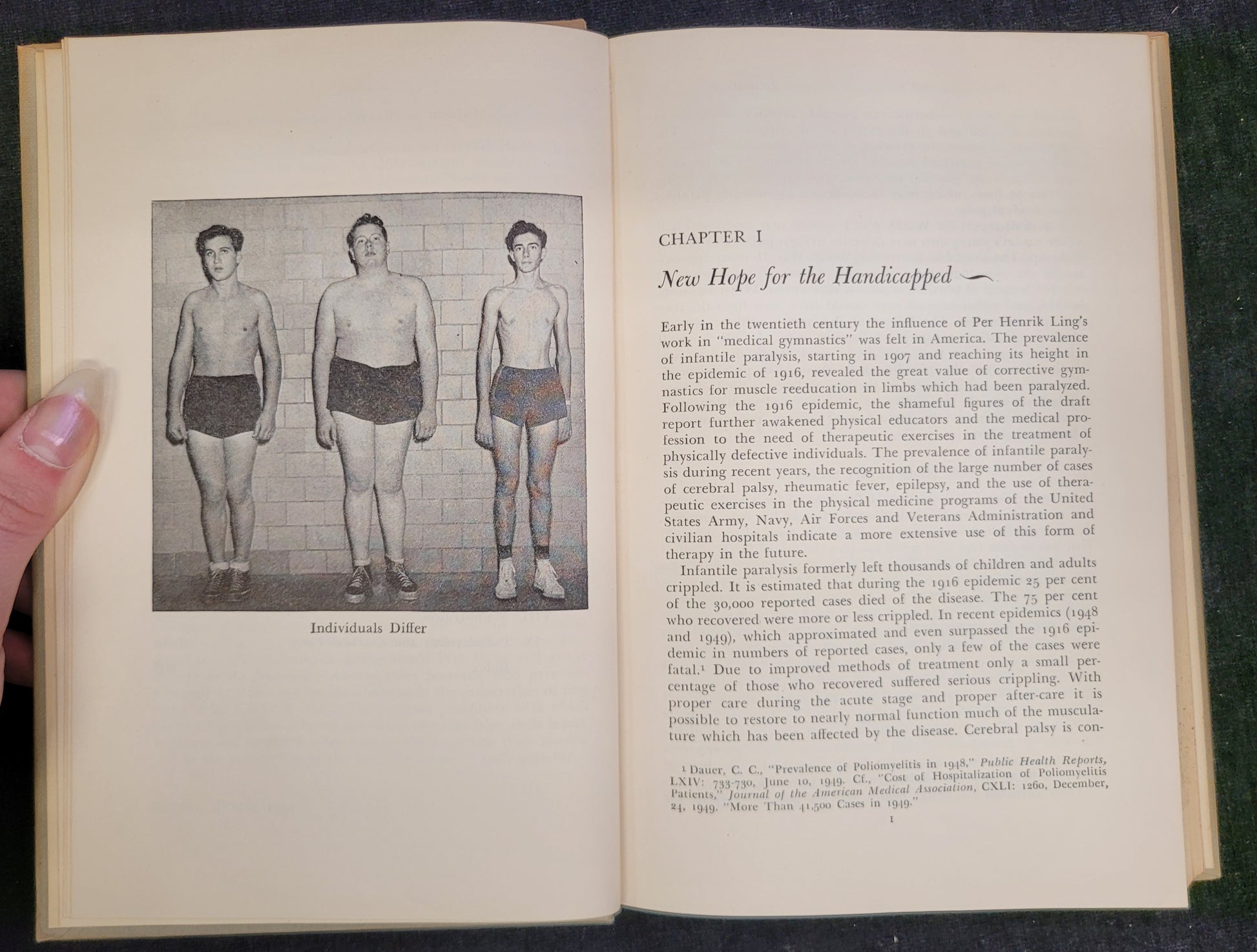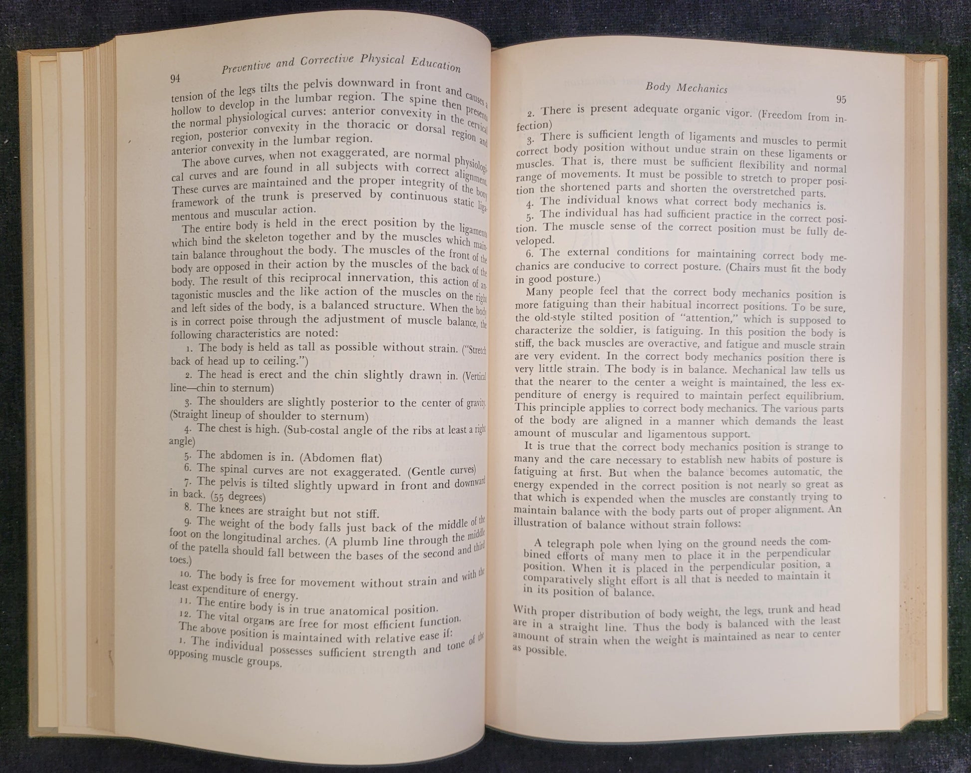 This is the second printing of a book originally published in 1928. It contains information on the best ways to teach individuals how to maintain physical wellness and correct physical differences. It is filled with pictures showing examples of "correct" body structures as well as different physical conditions such as scoliosis or cerebral palsy. While missing its dust cover, this book is in very good condition. There is some discoloration on the cover, but pages are nearly perfect.