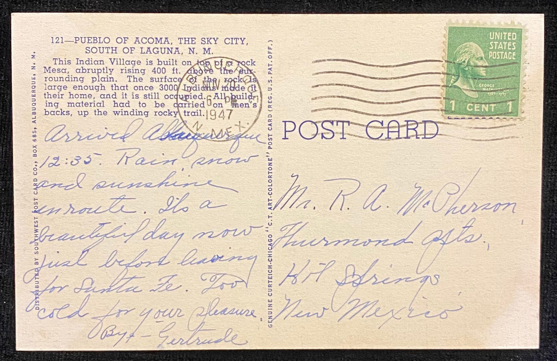Pueblo of Acoma, The Sky City, South of Laguna, N.M. | "This Indian Village is built on top of a rock Mesa, abruptly rising 400 ft. above the surrounding plain. The surface of the rock is large enough that once 3000 Indians made it their home, and it is still occupied. All building material had to be carried on men's backs, up the winding rocky trail."