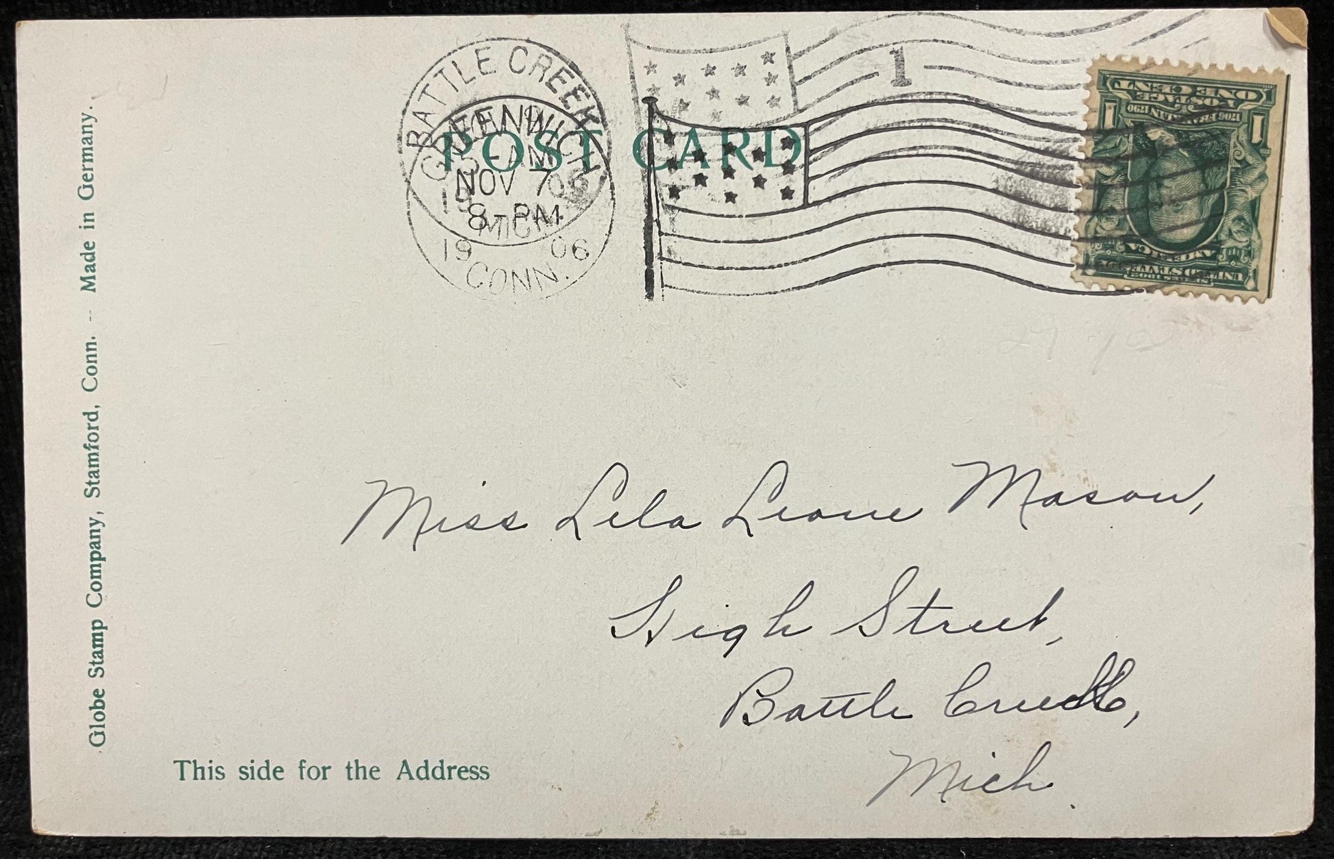 Mailed: Postmark Nov 7, 1906. Green one cent Benjamin Franklin stamp, placed upside down