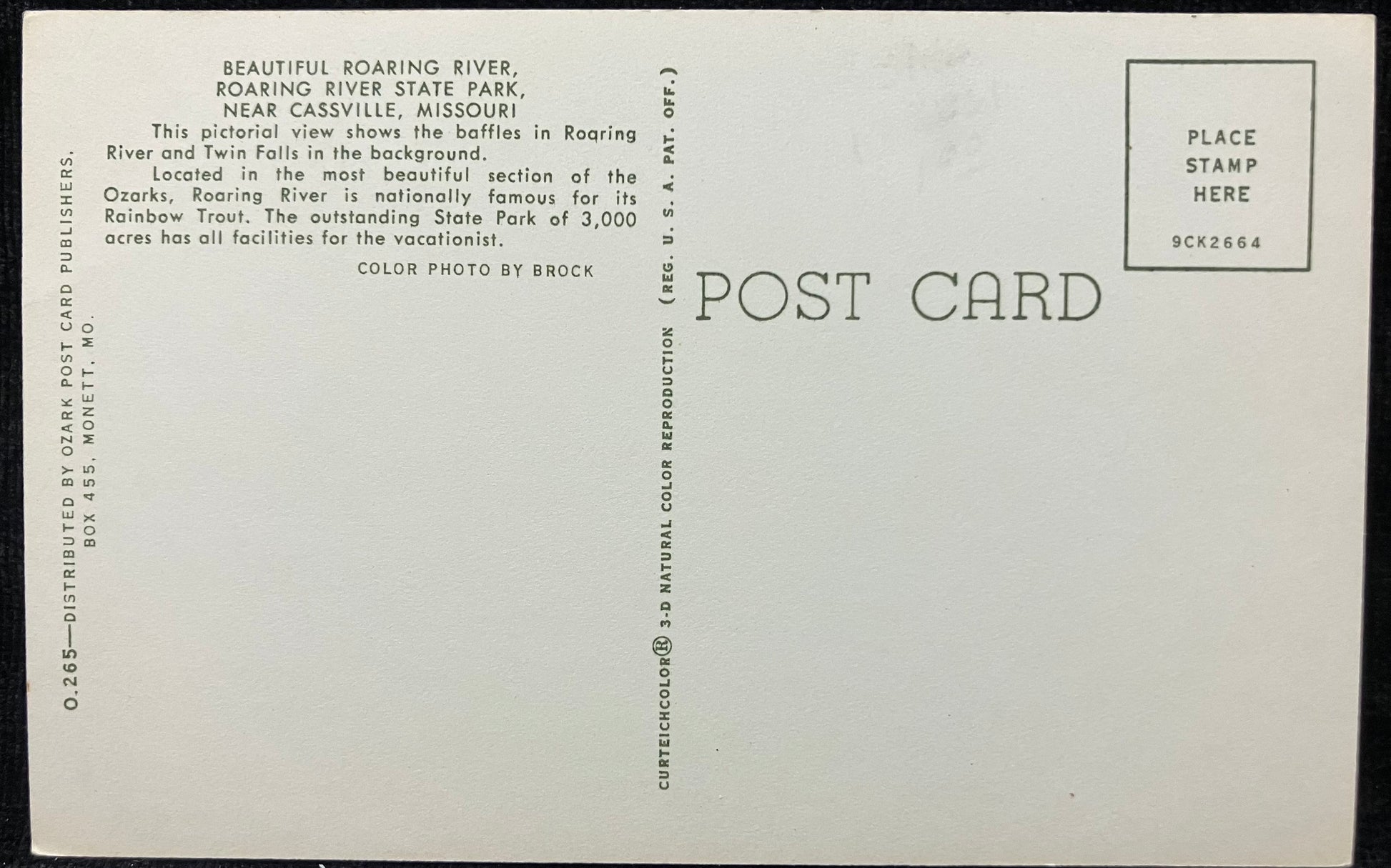 Back: BEAUTIFUL ROARING RIVER, ROARING RIVER STATE PARK, NEAR CASSVILLE, MISSOURI #€^| pictorial view shows the baffles in Roaring River and Twin Falls in the background. Located in the most beautiful section of the Ozarks, Roaring River is nationally famous for its Rainbow Trout. The outstanding Sate Park of 3,000 acres has all facilities for the vacationist.