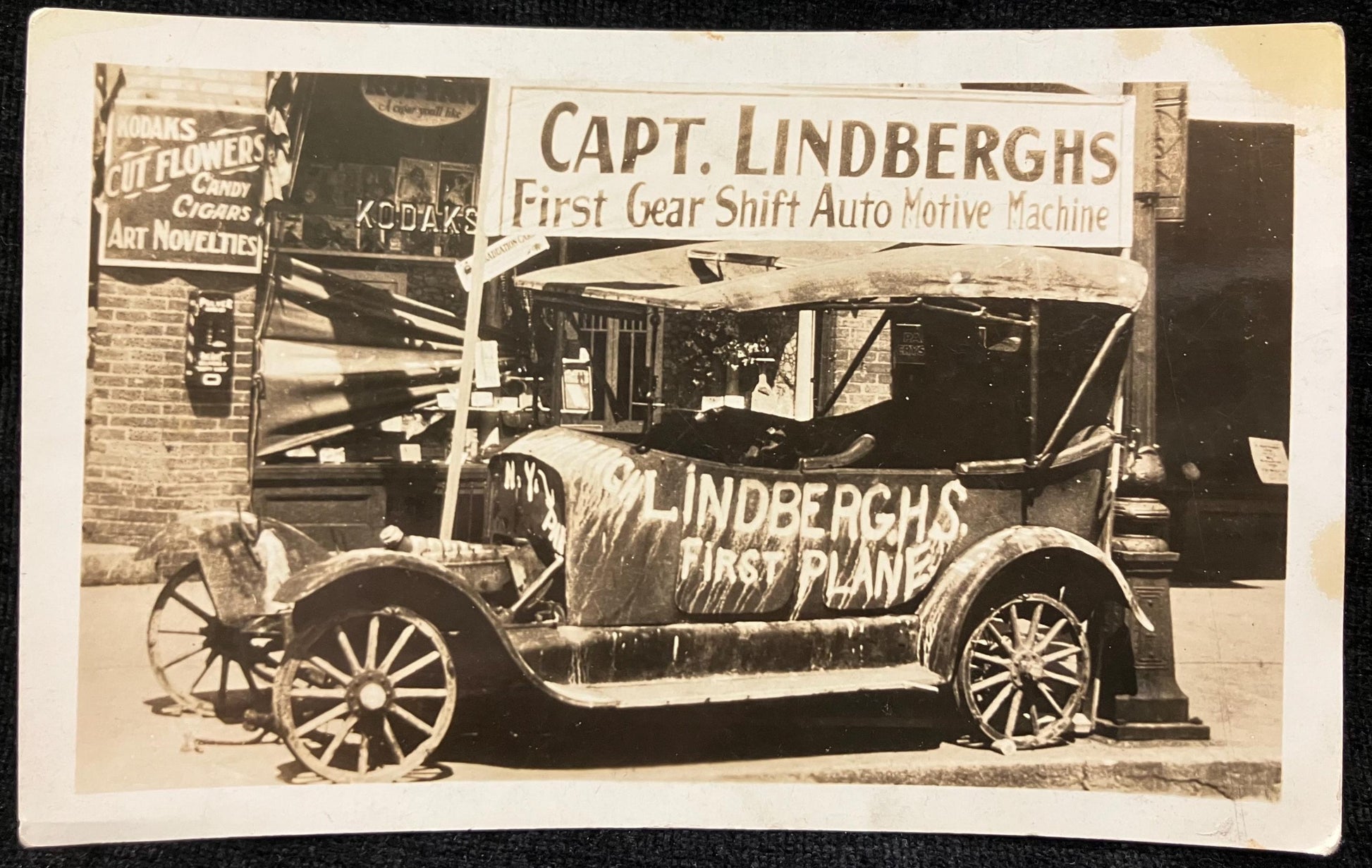 RPPC - Capt. Lindberghs First Gear Shift Auto Motive Machine - Kodak's Storefront in Background - Lindenberg's First Plane, Little Falls, Minnesota