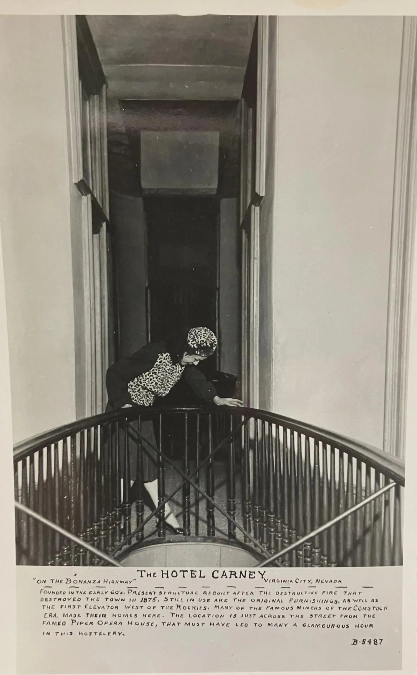 The Hotel Carney Virginia City, Nevada "On the Bonanza Highway - Founded int he early 60s, Present structure rebuilt after the destructive fire that destroyed the town in 1875. Still in Use are the Original Furnishings, as well as the First elevator west of the Rockies. Many of the famous miners of the Comstock Era, made their homes here. The location is just across the street form the Famed Piper Opera House, that must have led to many a Glamourous Hour int his Hostelery.