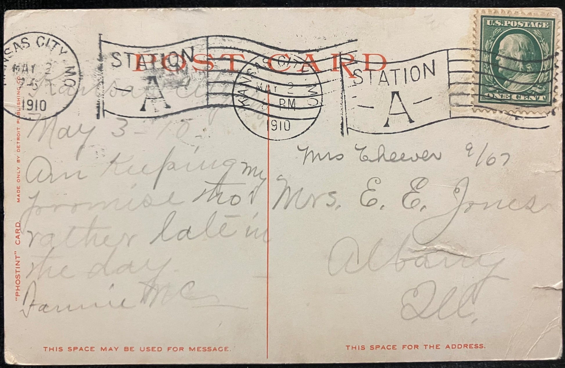 Mailed: Postmark on May 2, 1910 from Kansas City, MO. with a green one cent Benjamin Franklin stamp