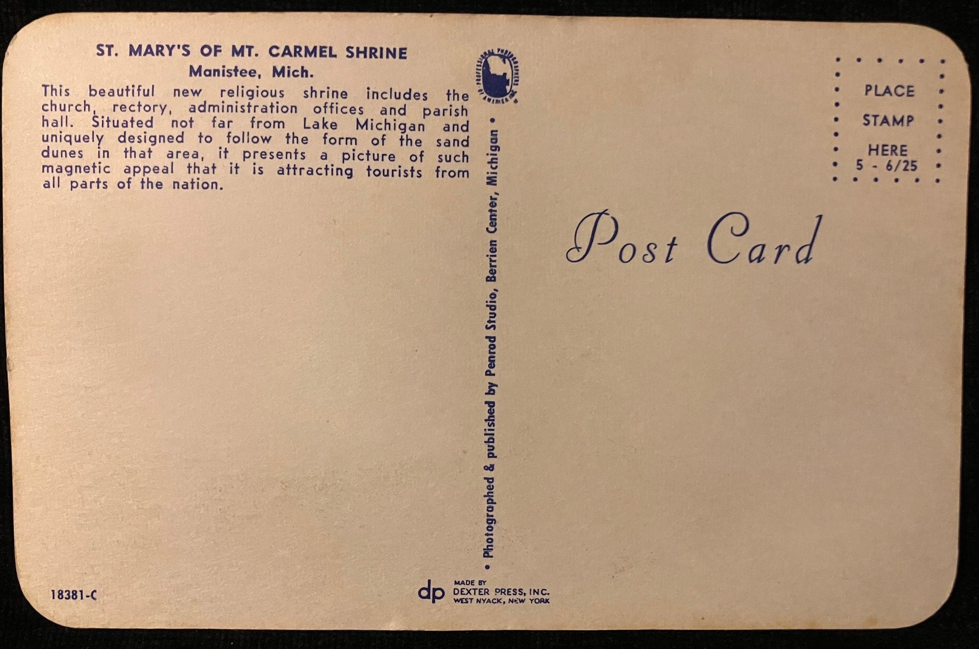 On front: St. Mary’s of Mt. Carmel Shrine in Manistee, Mich
