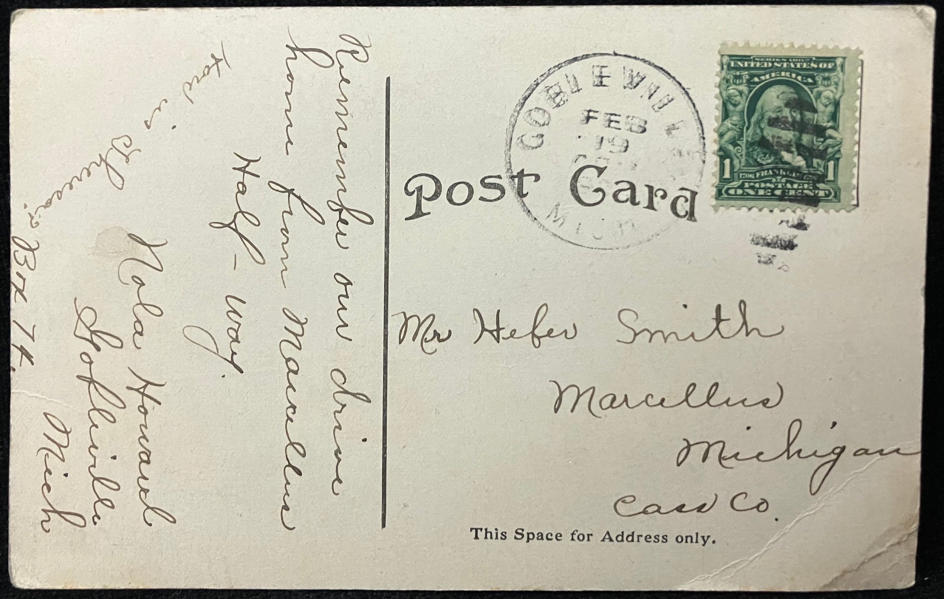 Mailed: Postmark in the 1920s from Gobleville, Mich. with a green one cent Benjamin Franklin card