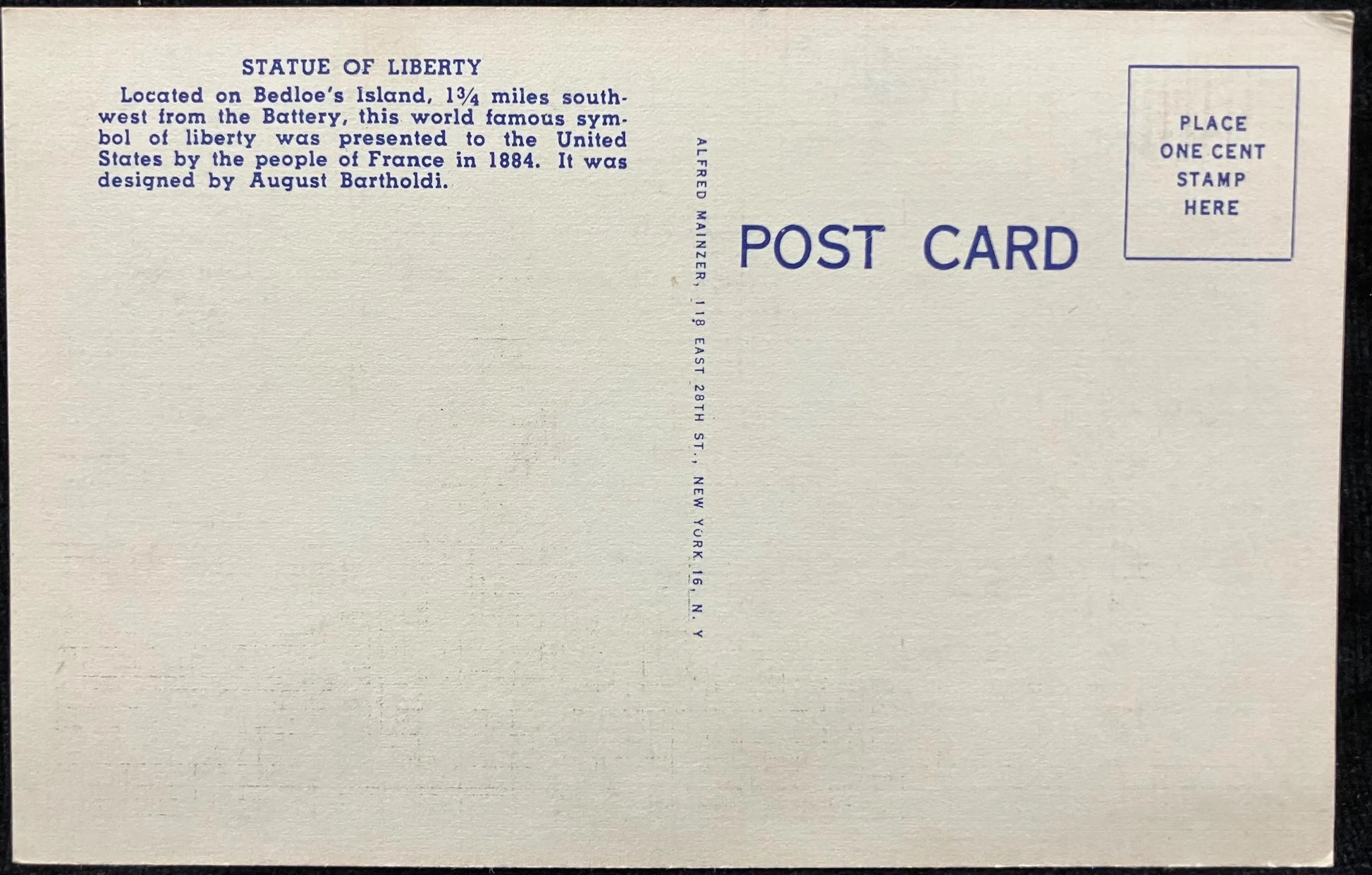 Back: STATUE OF LIBERTY Located on Bedloe’s Island, 1 3/4 miles southwest from the Battery, this world famous symbol of liberty was presented to the United States by the people of France in 1884. It was designed by August Bartholdi.
