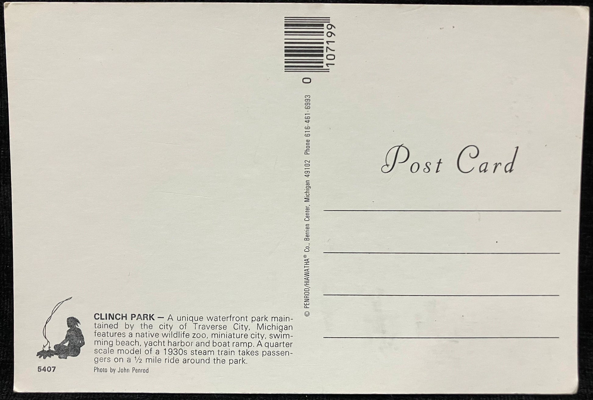 Back: CLINCH PARK - A unique waterfront park maintained by the city of Traverse City, Michigan, features a native wildlife zoo, miniature city, swimming beach, yacht harbor and boat ramp. A quarter-scale model of a 1930s steam train takes passengers on a 1/2 mile ride around the park.