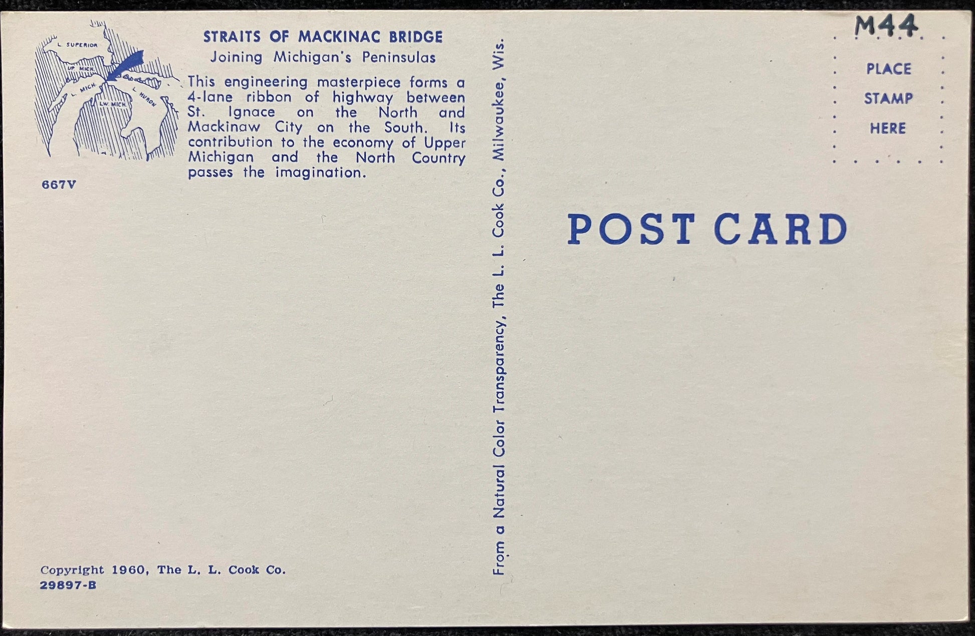Back: STRAITS OF MACKINAC BRIDGE Joining Michigan’s Peninsulas This engineering masterpiece forms a Roland ribbon of highway between St. Ignace on the NOrth and Mackinaw City on the South. ITs contribution to the economy of Upper Michigan and the North Coutnry passes the imagination.