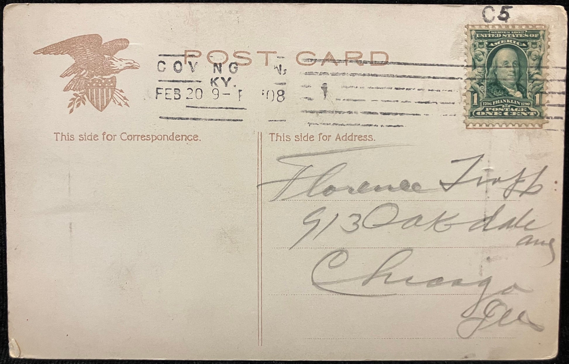 Mailed: Postmark: 1908, green one cent Benjamin Franklin stamp