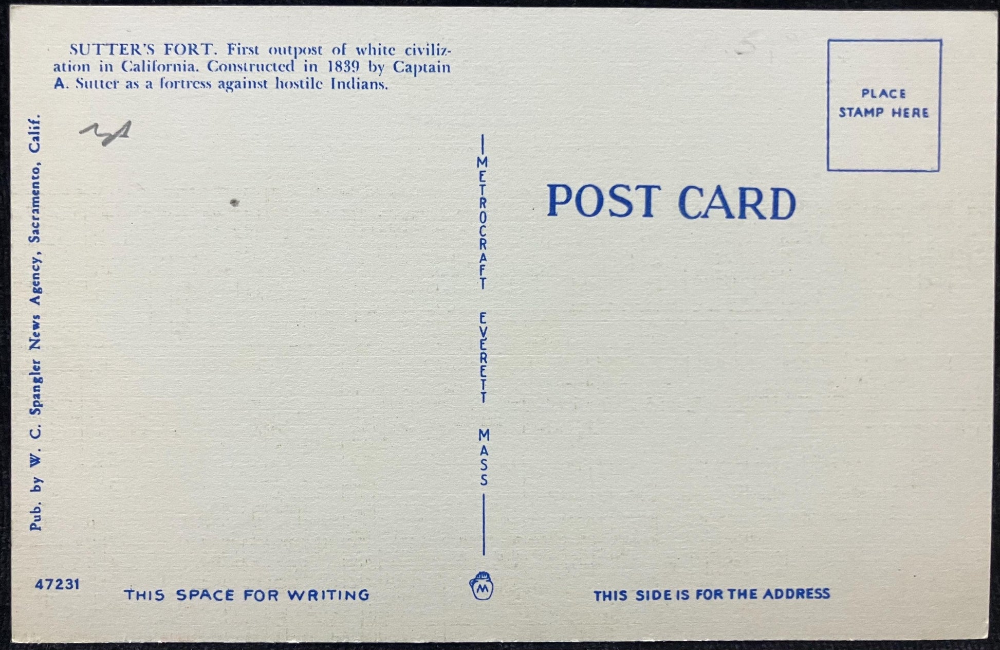 Back: SUTTER’S FORT. First outpost of white civilization in California. Constructed in 1839 by Captain A. Sutter as a fortress against hostile Indians.