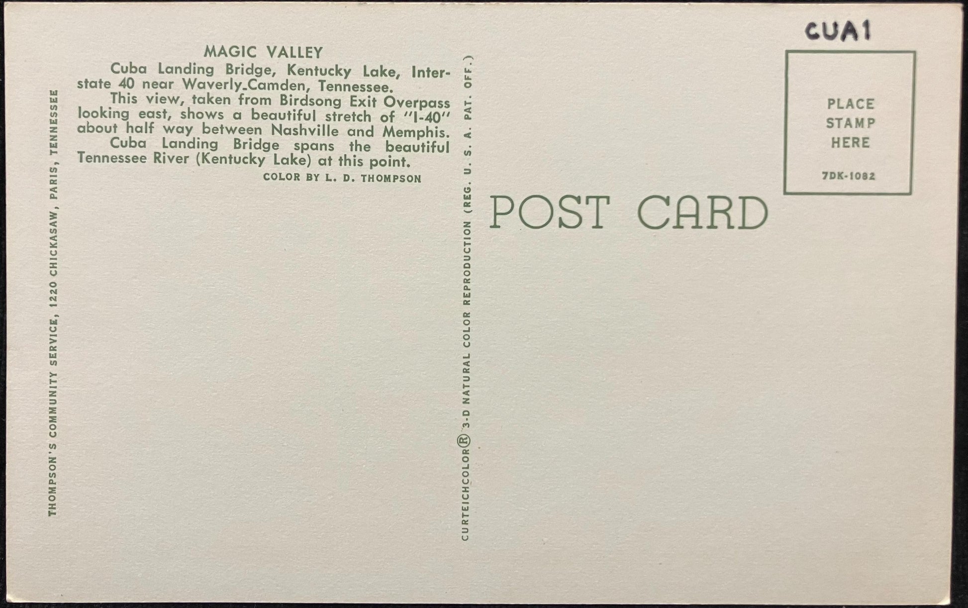 Back: MAGIC VALLEY Cuba Landing Bridge, Kentucky Lake, Interstate 40 near Waverly-Camden, Tennessee. This view, taken from Birdsong Exit Overpass looking east shows a beautiful stretch of “I-40” about halfway between Nashville and Memphis. Cuba Landing Bridge spans the Beautiful Tennessee River (Kentucky Lake) at this point.