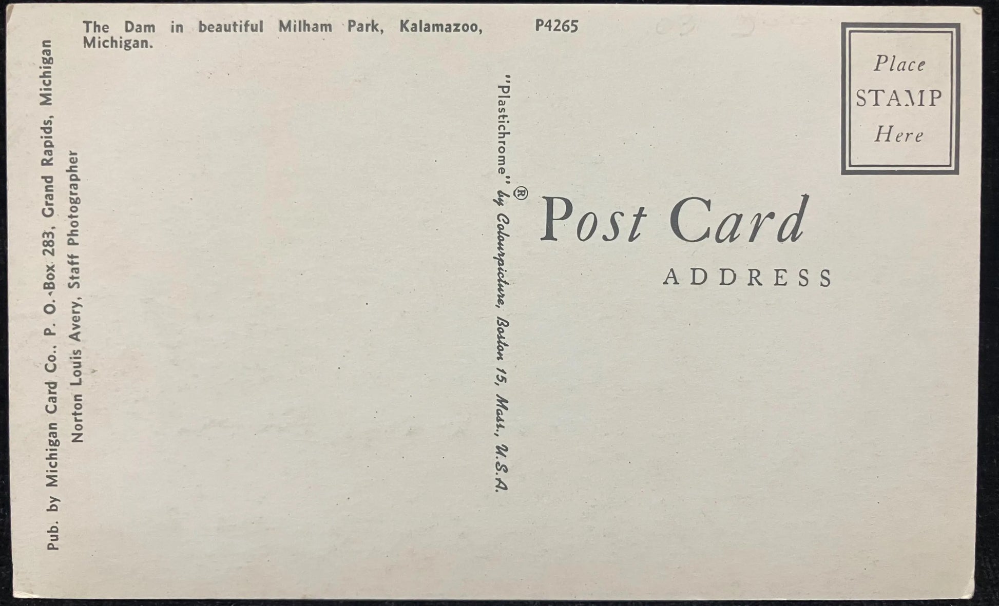 The Dam at Milham Park, Kalamazoo, Michigan - Vintage Park Postcard