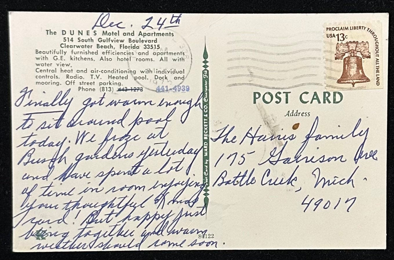 Beautifully furnished efficiency and apartments with G.E. Kitchens. Also hotel rooms. All with water view. Central heat and air-conditioning with individual controls. Radio. T.V. Heated pool. Dock and mooring. Off street parking Phone (813) {scratched out is 442-1273} 441-4939.