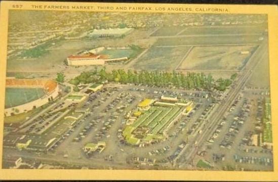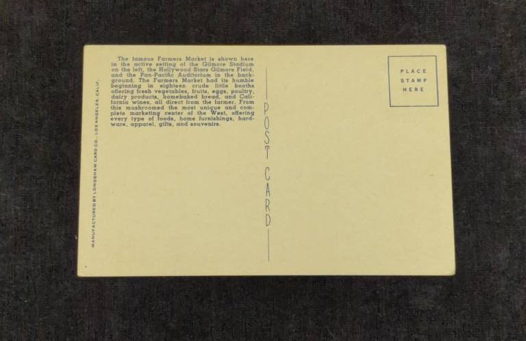 Back: The famous Farmers Market is shown here in the active setting of the Gilmore Stadium on the left, the Hollywood Stars Gilmore Field, and the Pan-Pacific Auditorium in the background. The Farmers Market had its humble beginning in the eighteen crude little booths offering fresh vegetables, fruits, eggs, poultry, dairy products, homebred bread and California wines, all direct from the farmer. From this mushroomed the most unique and complete marketing center of the west, offering every type of foods, home furnishings, hardware, apparel, gifts and souvenirs.
