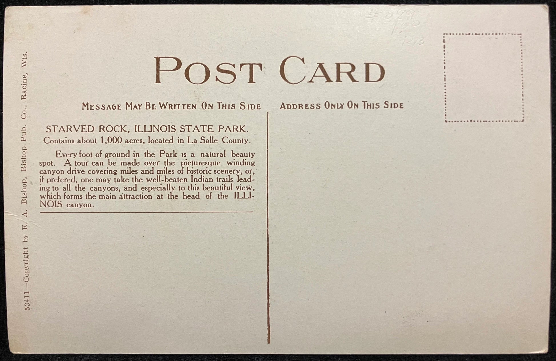 Back: STARVED ROCK, ILLINOIS STATE PARK. Contains about 1,000 acres, located in La Salle County. Every foot of ground in the Park is a natural beauty spot. A tour can be made over the picturesque winding canyon drive covering miles and miles of historic scenery, or, if preferred, one may take the well-beaten Indian trails leading to all the canyons, and especially to this beautiful view, which forms the main attraction at the head of the ILLINOIS canyon.