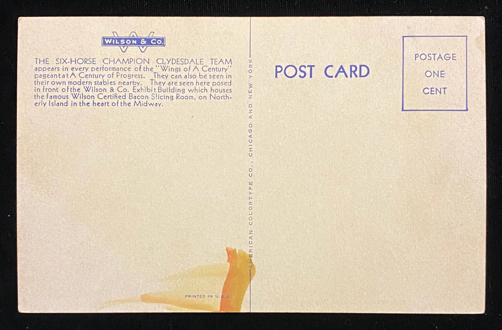 Back Information: "The six-horse champion Clydesdale team appears in every performance of the 'Wings of A Century' pageant at A Century of Progress. They can also be seen in their own modern stables nearby. They are seen here posed in front of the Wilson & Co. Exhibit Building which houses the famous Wilson Certified Bacon Slicing Room, on Northerly Island in the heart of the Midway."